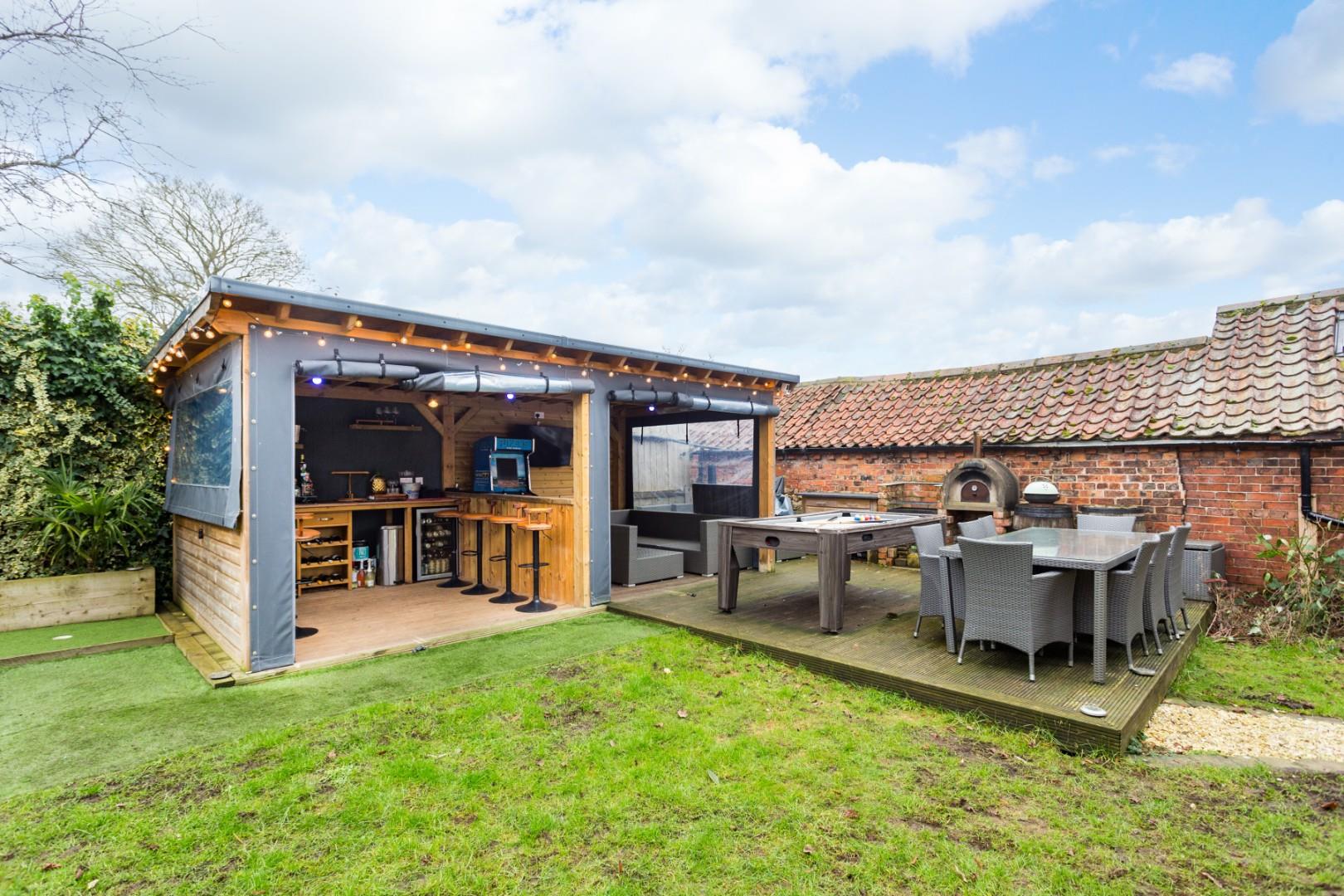 This home truly comes into its own when you step outside. The rear garden has been transformed into a private oasis that seamlessly blends relaxation and entertainment. At its heart is a covered and heated outdoor lounge, designed for year-round enjoyment, complete with a built-in bar area on one side and an outdoor kitchen—featuring a BBQ and pizza oven—on the other.