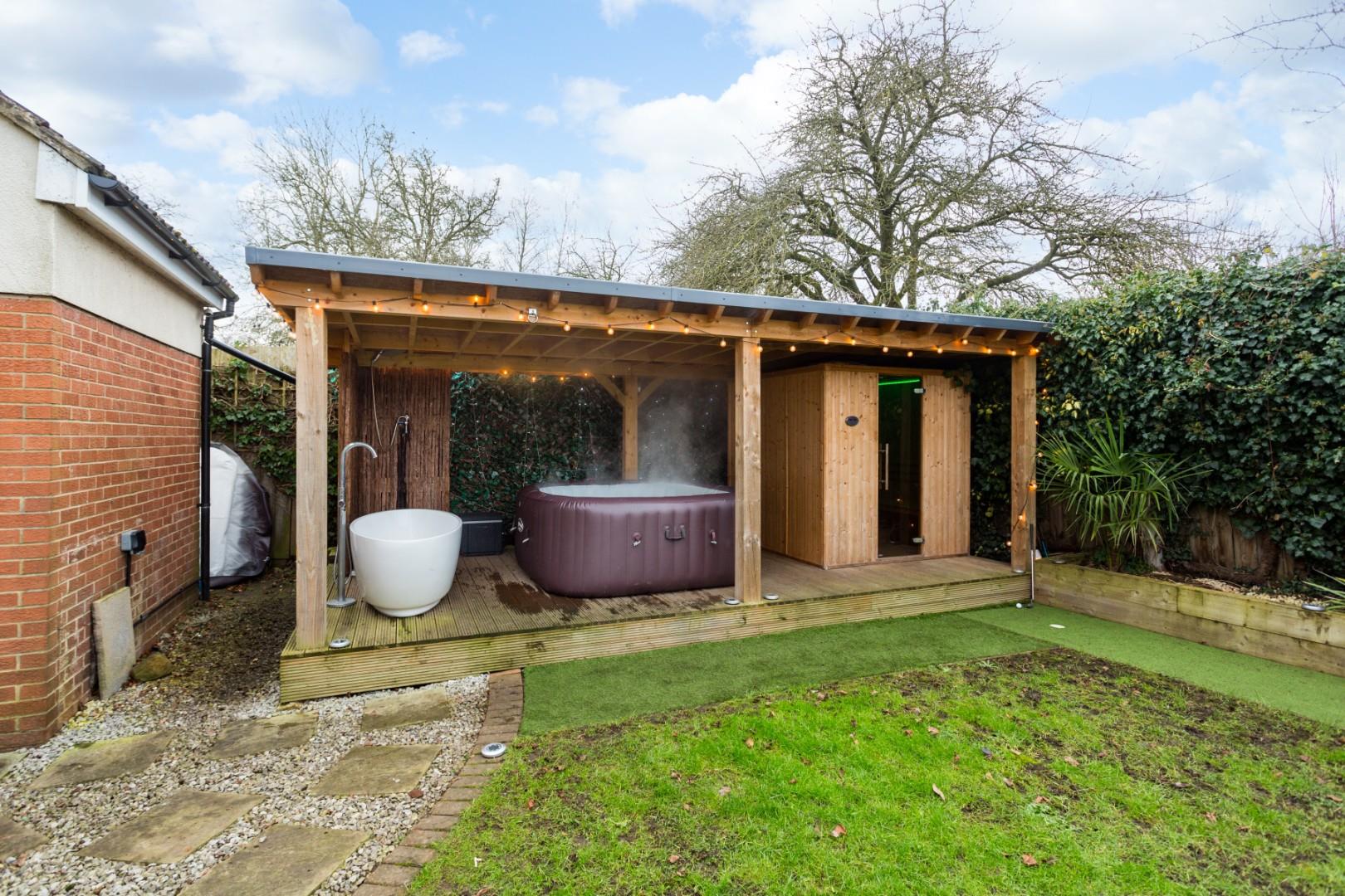For those who love to unwind, the dedicated ‘Spa’ area offers a sauna, space for a Jacuzzi, and an ice bath with a shower—a luxury touch that sets this home apart. The centrepiece of the garden is a manicured lawn, while the addition of an artificial putting green makes this a dream space for golfers looking to perfect their short game from the comfort of home.
