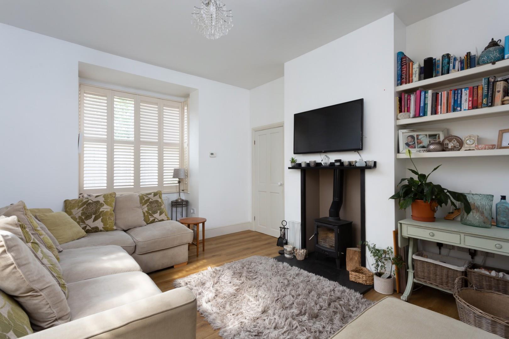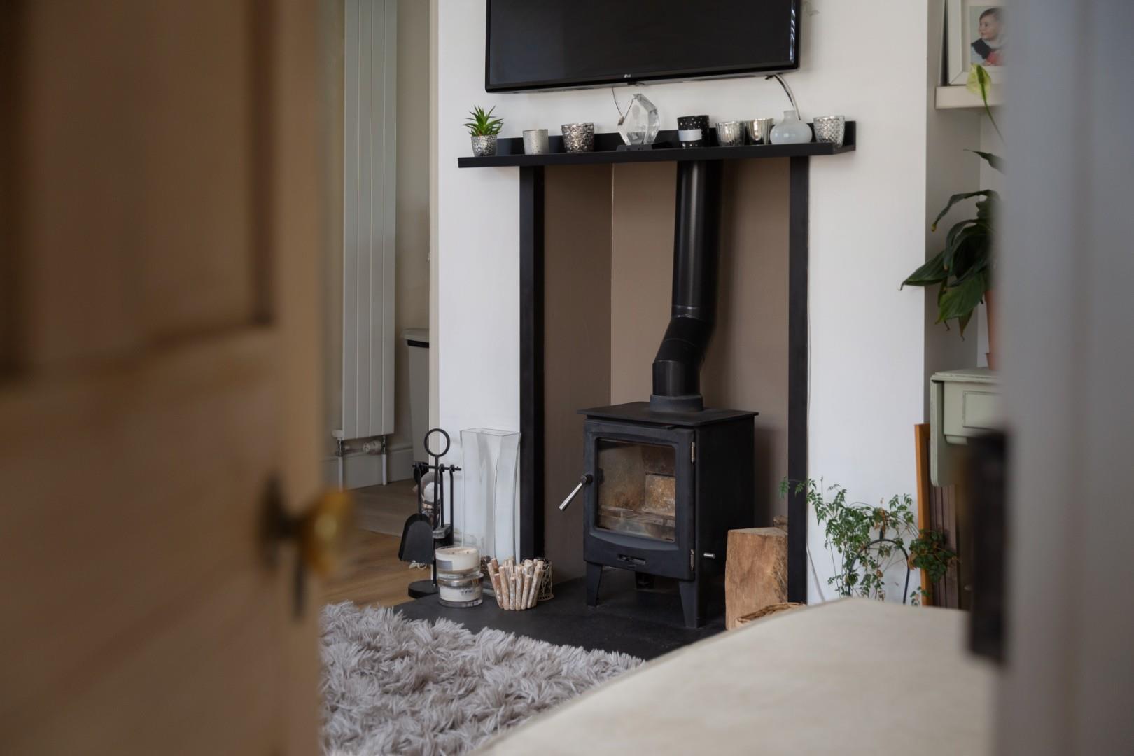 The lounge sits to the front of the property and offers a warm yet spacious setting, with dual-aspect windows to the front and side elevations. A centrally positioned inset log burner provides a charming focal point, while an understairs cupboard offers useful storage.