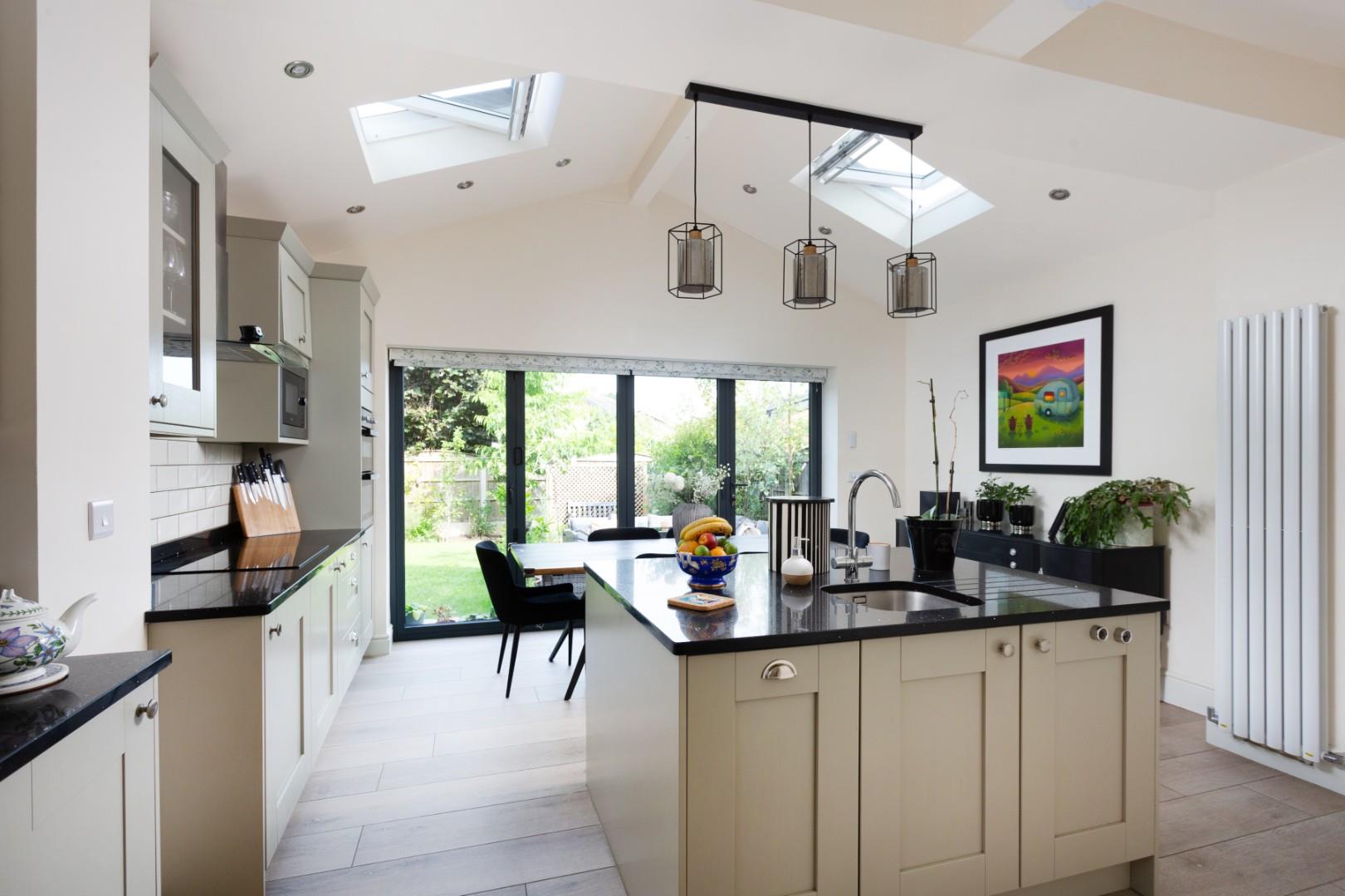 The extension maximises the available space beautifully, boasting vaulted ceilings and abundant natural light through twin Velux windows and large bi-fold doors. This bright and versatile area provides the perfect setting for both everyday family living and entertaining guests.