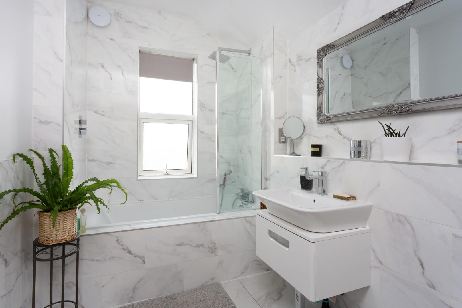 The ground floor is further enhanced by a secondary house bathroom, which has been recently updated by the current owners. This stylish space features a modern walk-in shower, a vanity unit with hand wash basin, and a low-flush WC. There is also a useful built-in storage area, adding to the practicality of the room.
