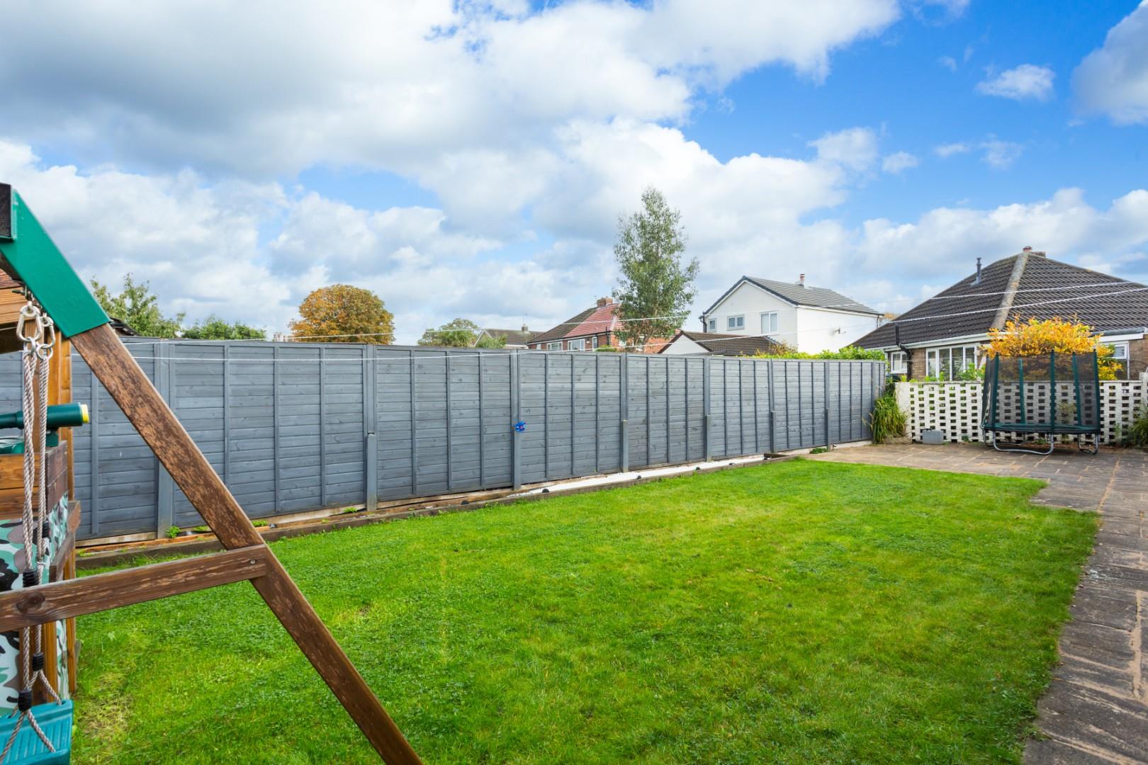 Outside, the property sits on a generous plot with a neat front lawn and private driveway. The rear garden is fully enclosed and features a flagged patio and lawned area.