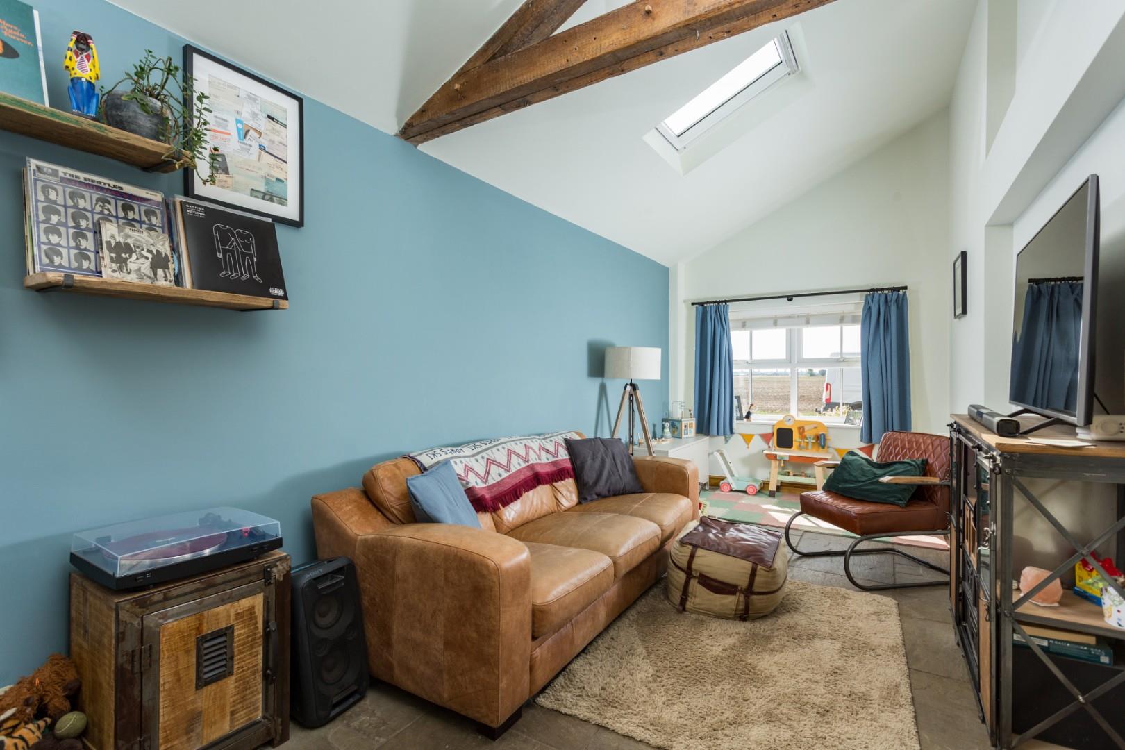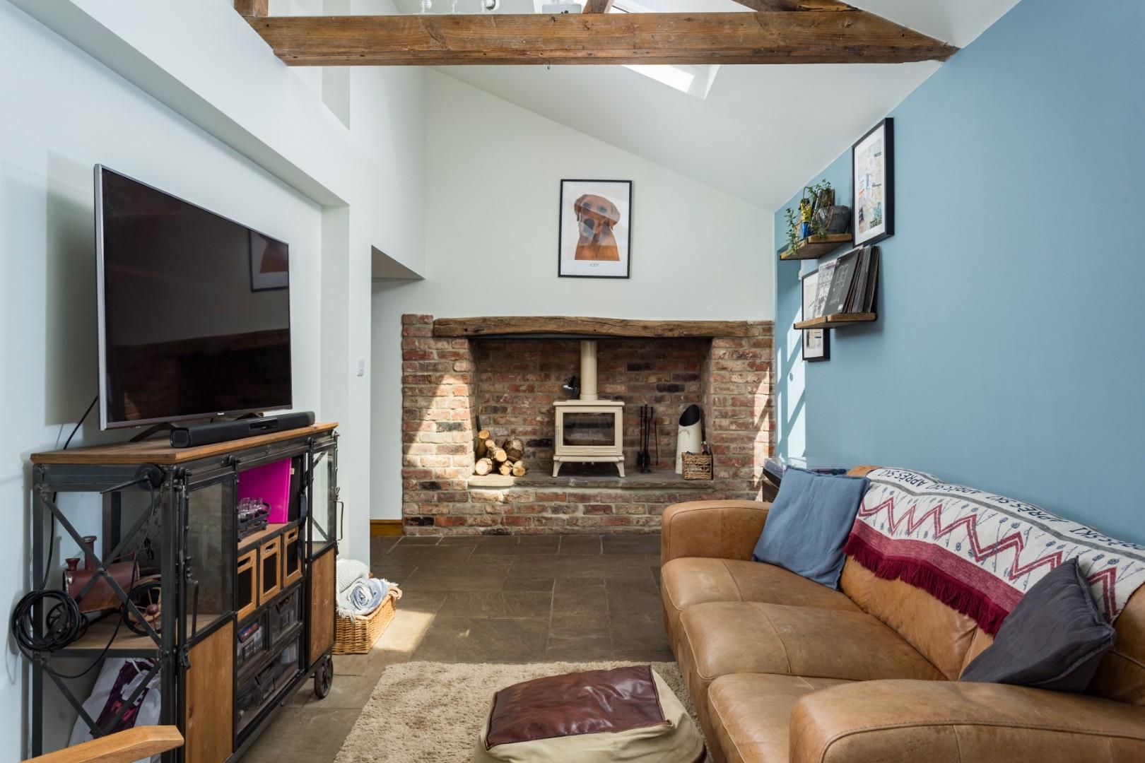 The ground floor is completed by a beautiful formal lounge - a space that is both cosy and impressively proportioned. Bathed in natural light, the room centres around a striking brick-built fireplace, home to a dual-burning stove set beneath a solid oak beam. The vaulted ceiling, with its exposed timber framework, lends a sense of openness and architectural interest, while the views from the windows capture the surrounding fields to both the front and side, reinforcing the home's idyllic rural setting.