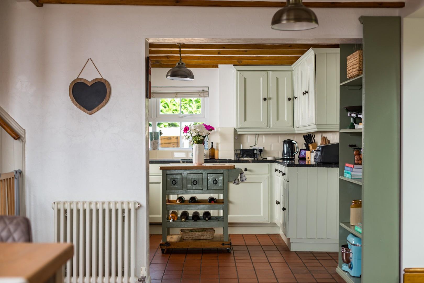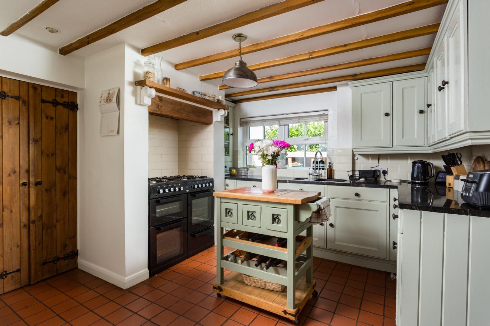 The kitchen flows seamlessly from the dining area, creating a harmonious space that balances functionality with timeless style. Fitted with a range of wall and base units to two sides, the room is enhanced by granite work surfaces and a sink unit with drainer with mixer tap over, while an electric Rangemaster style oven is perfectly set within an alcove, framed by a rustic oak beam above. Discreetly positioned within the kitchen is a walk-in pantry, equipped with shelving and offering excellent additional storage.