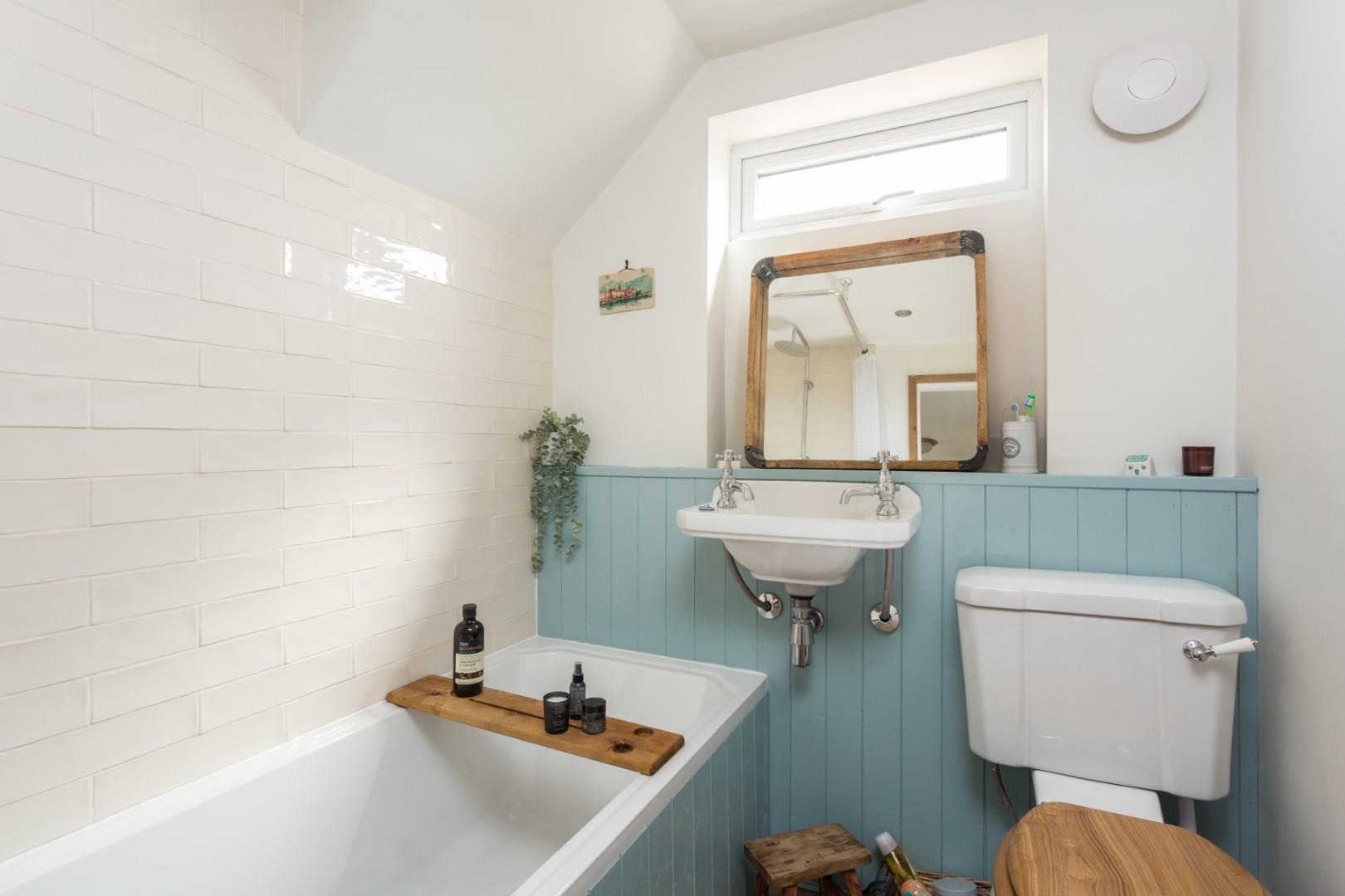 The house bathroom is tastefully presented, featuring an inset bath with shower attachment, a hand wash basin, and a low-flush WC.