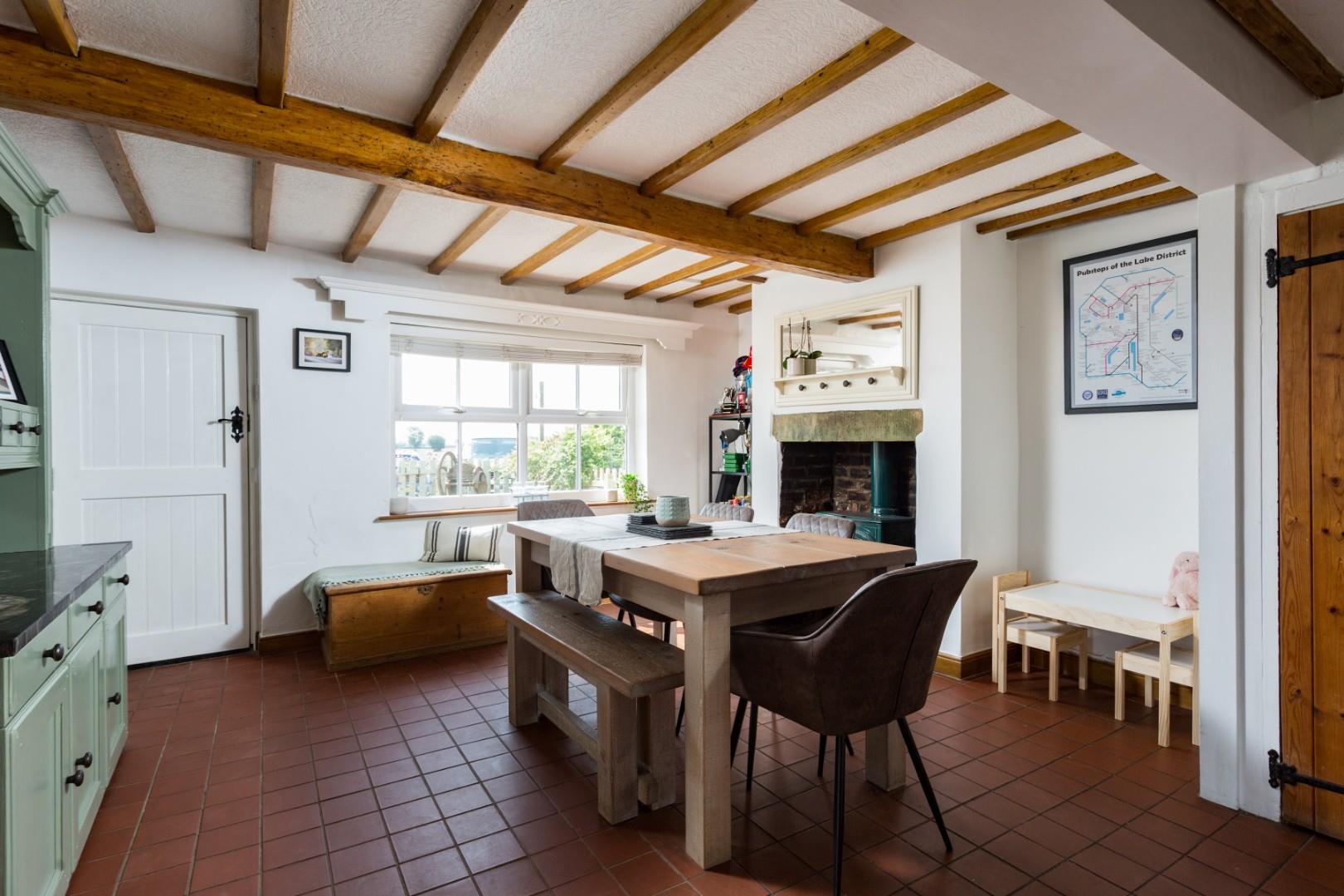 On arrival, the cottage welcomes you through an apex-roofed timber porch, beneath which a characterful front door opens into the heart of the home. The present owners use this open-plan space as a dining area, though its versatility allows for a variety of uses depending on the needs and lifestyle of the next purchaser(s). Rich in period features, the space is adorned with red tiled flooring, much of which is believed to be original, along with exposed oak beams to the ceiling. A central fireplace, complete with a log-burner-style gas fire, serves as a focal point adding both warmth and visual interest to the room.