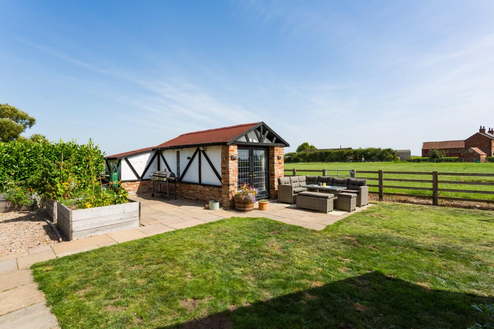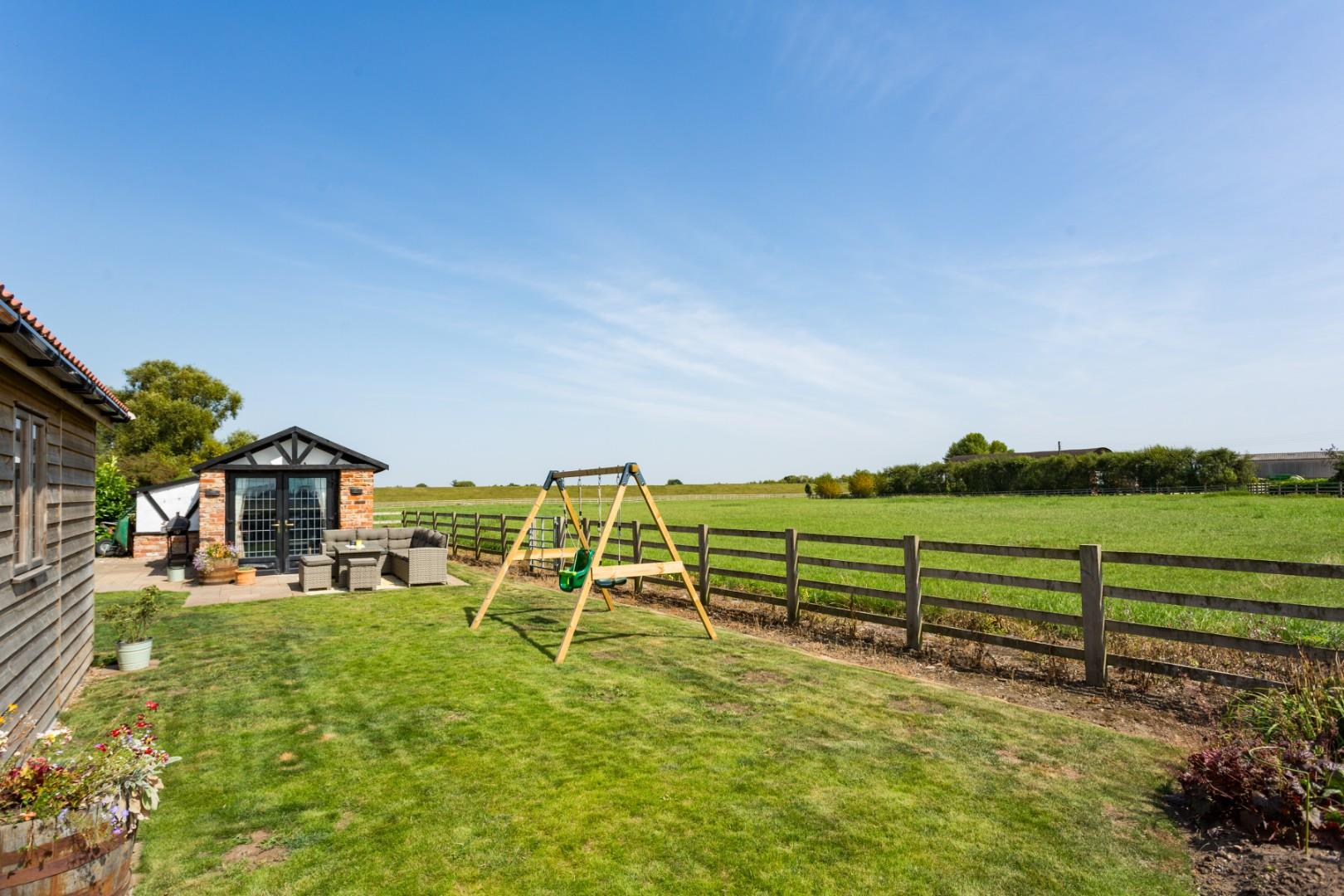 The plot, extending to approximately 0.10 acre, is surrounded by open farmland. To the side of the property, a lawned garden offers a pleasant outdoor space, while a brick-built, timber-framed garden bar provides a unique and versatile feature, complete with double-glazed double doors, a timber-framed single-glazed window, stone flooring, power, and lighting.