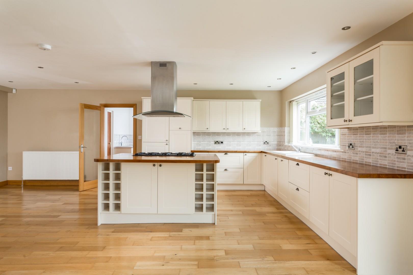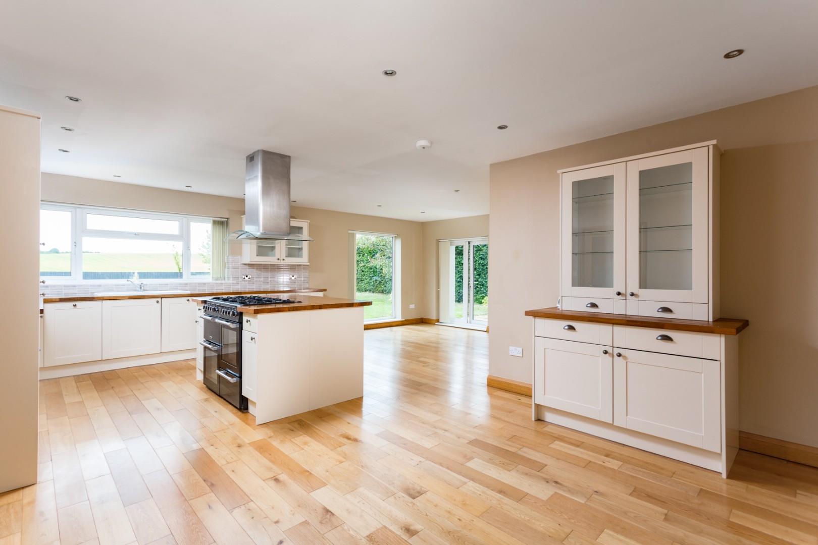 One of the outstanding features of the property is the substantial living kitchen which benefits from a combination of base, wall and full height storage units with timber preparation surfaces incorporating a 1 & 1/2 ceramic sink with drying area. There is also a feature breakfast island again with timber preparation surfaces which offers additional storage space. The room has ample space for a dining table and the opportunity to create a more relaxed seating area. There are a number of integrated appliances, including a Leisure gas range cooker, fridge/freezer and dishwasher. The kitchen enjoys wonderful views out over the rear garden and has French doors leading out to it.