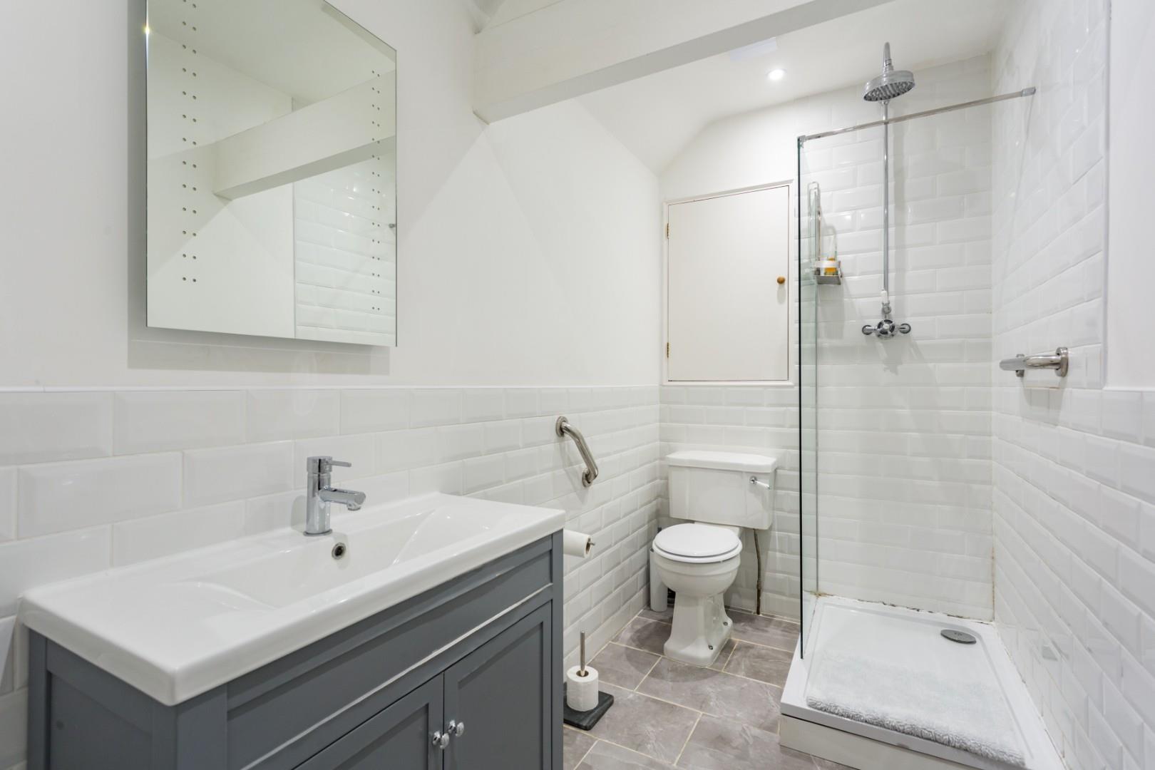 The first floor landing features exposed beams, 10'10" (3.30m) high vaulted ceilings and doors leading off into a principal double bedroom with built-in wardrobe, one single bedroom and a stylish shower room with a vanity unit and a walk-in shower.