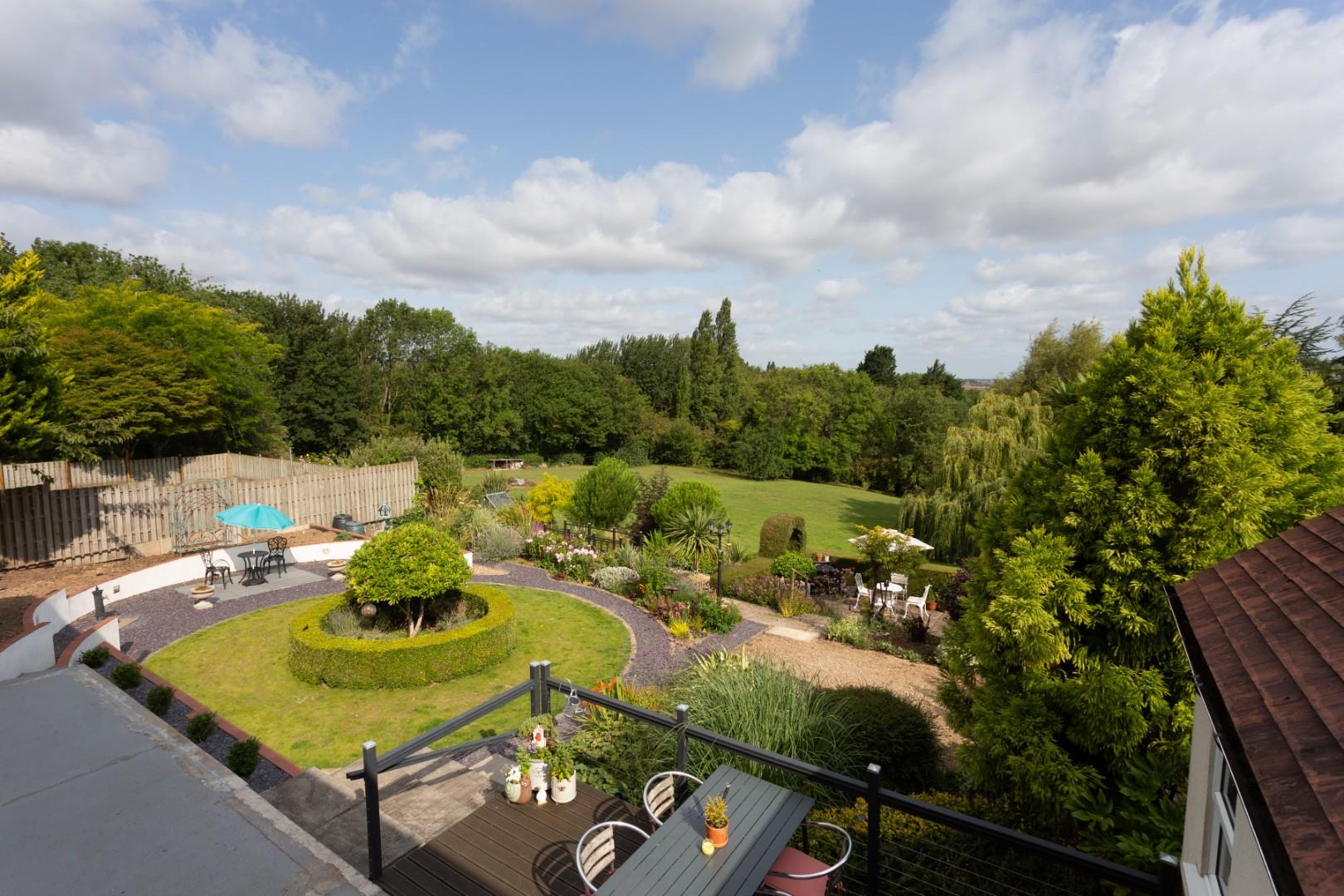 A series of beautifully designed terraces and pathways wind through manicured lawns, vibrant planting schemes, and carefully curated seating areas, all thoughtfully positioned to take full advantage of the views over the extended gardens beyond. At the center, a circular lawn with a neatly clipped hedge and ornamental tree creates a focal point, while nearby patios and suntraps offer perfect spots for al fresco dining or quiet reflection. Further into the garden, a charming footbridge spans a decorative water feature, leading to a secluded section planted with plants and shrubs with a concrete pathway leading to the paddock land and beyond. Discreetly nestled among the mature borders, a summerhouse and various seating areas provide quiet retreats throughout the garden. This is a space of exceptional quality and vision - not merely an extension of the home, but a lifestyle offering privacy, tranquility, and an outdoor environment rarely found in such a setting.