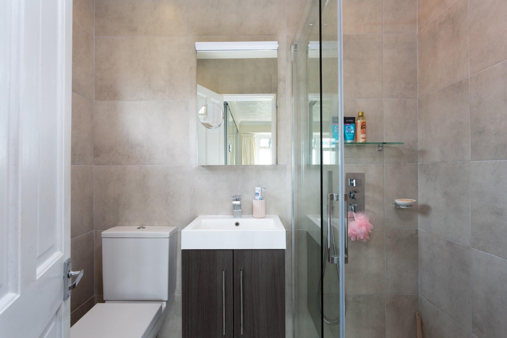 Both house bathrooms have been completed with elegant, contemporary design. The main bathroom features an inset bath surrounded by modern tiling, a sleek vanity hand wash basin, and a low-flush WC. Enhancing the sense of luxury, this space also includes a built-in steam room and recessed spotlights set into the ceiling.