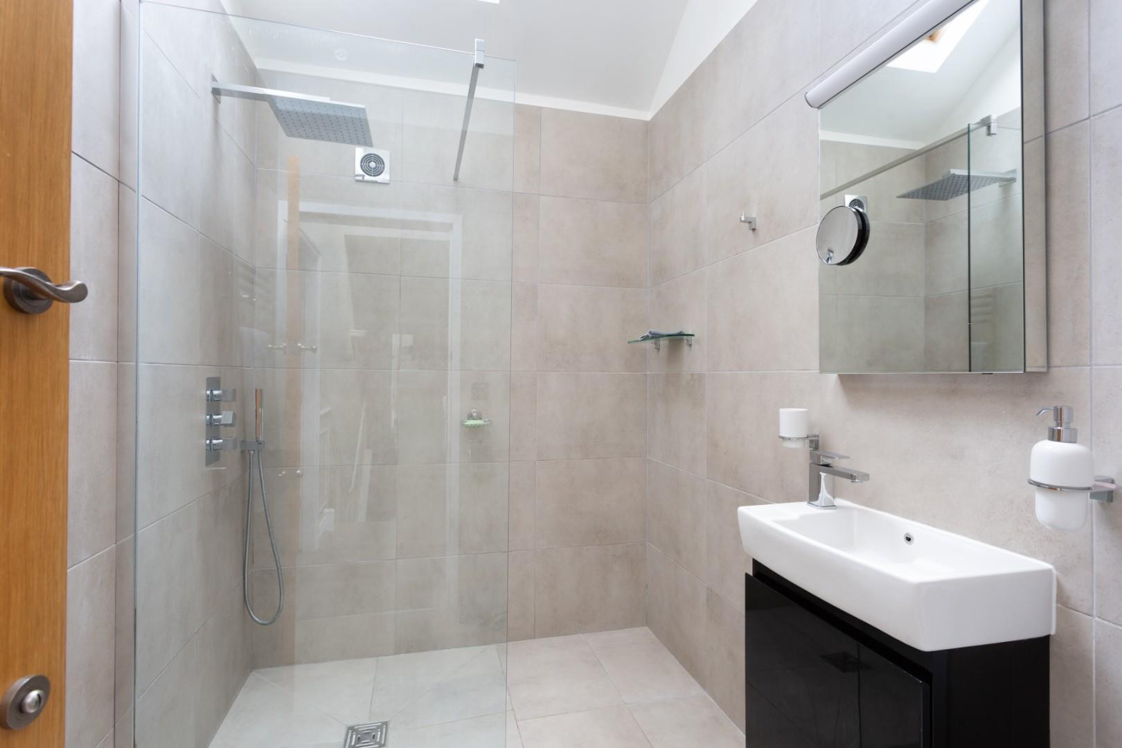 The secondary bathroom is equally impressive, presented having a walk-in shower enclosure, vanity hand wash basin, and two Velux windows that flood the space with natural light.