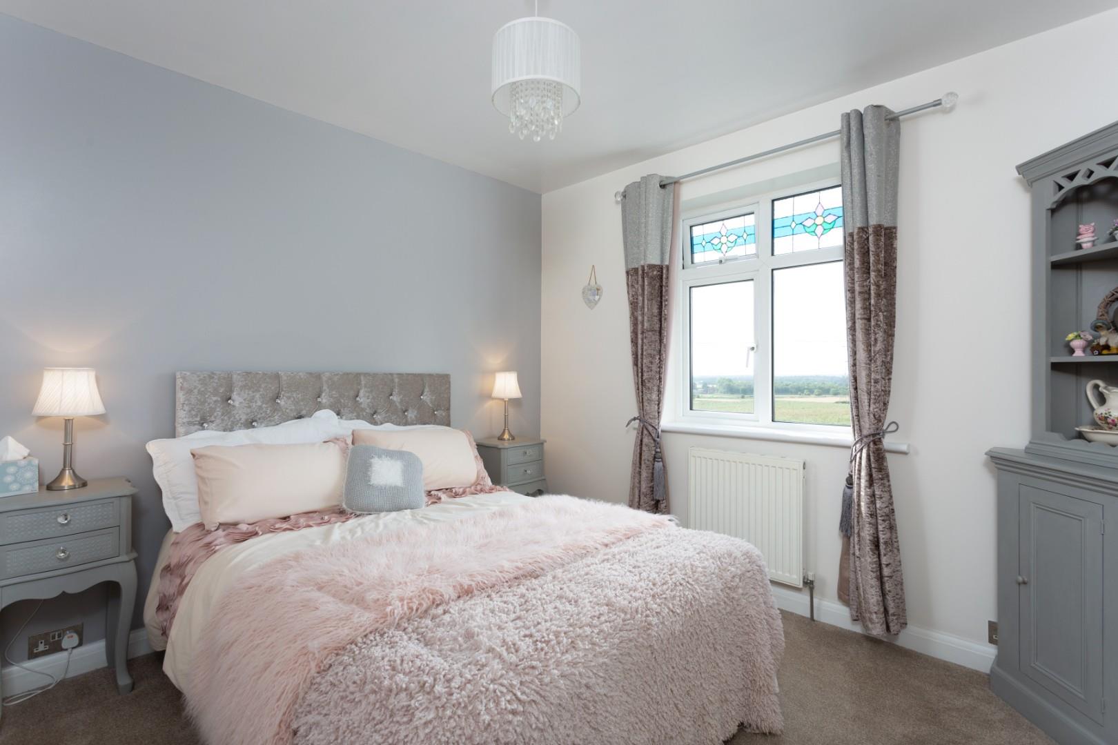 Ascending to the first floor, a split-level landing provides access to five generously sized double bedrooms and two well-appointed house bathrooms. To the left, the landing leads to three double bedrooms and the principal bathroom, while to the right, a further two double bedrooms are served by a stylish secondary bathroom. Each bedroom is double in size and benefits from a double-glazed window, central heating radiator, and modern décor, with traditional oak-style internal doors. There is a stylish en suite off the principal bedroom with a sleek, modern walk-in shower with a frameless glass screen. There is a contemporary vanity unit with integrated hand-wash basin and low-flush WC. Full-height tiling in a modern finish surrounds the room, providing a seamless, high-end look. The elevated first-floor position offers some of the finest, far-reaching views across open countryside, with a backdrop to the rear of privately owned gardens and fields beyond. On a clear day, the panorama extends to include the majestic York Minster and the iconic White Horse on the edge of the North York Moors.