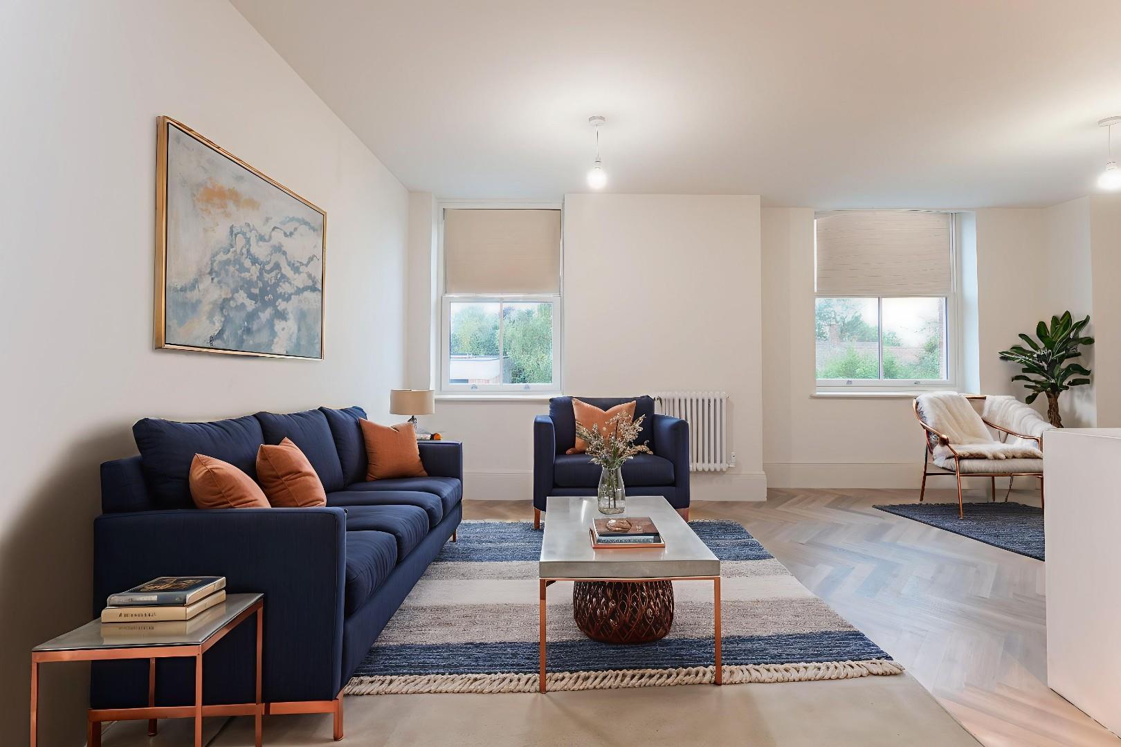 The standout space is undoubtedly the stunning kitchen/dining room. As the apartment features amazingly high ceilings throughout, this is an impressive open space, offering a high-specification kitchen and ample space for a dining area as well as an informal seating area. The kitchen itself comprises luxury Sheraton shaker-style cabinets with antique brass handles, quartz worktops and upstands in Vienna Gold, with a range of integrated NEFF appliances and opulent central island. A separate living room presents a sizeable yet cosy room, a perfect space to take a few moments to relax.
