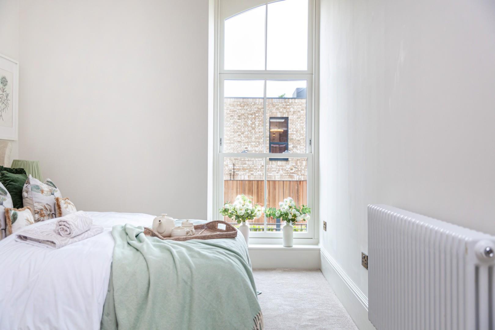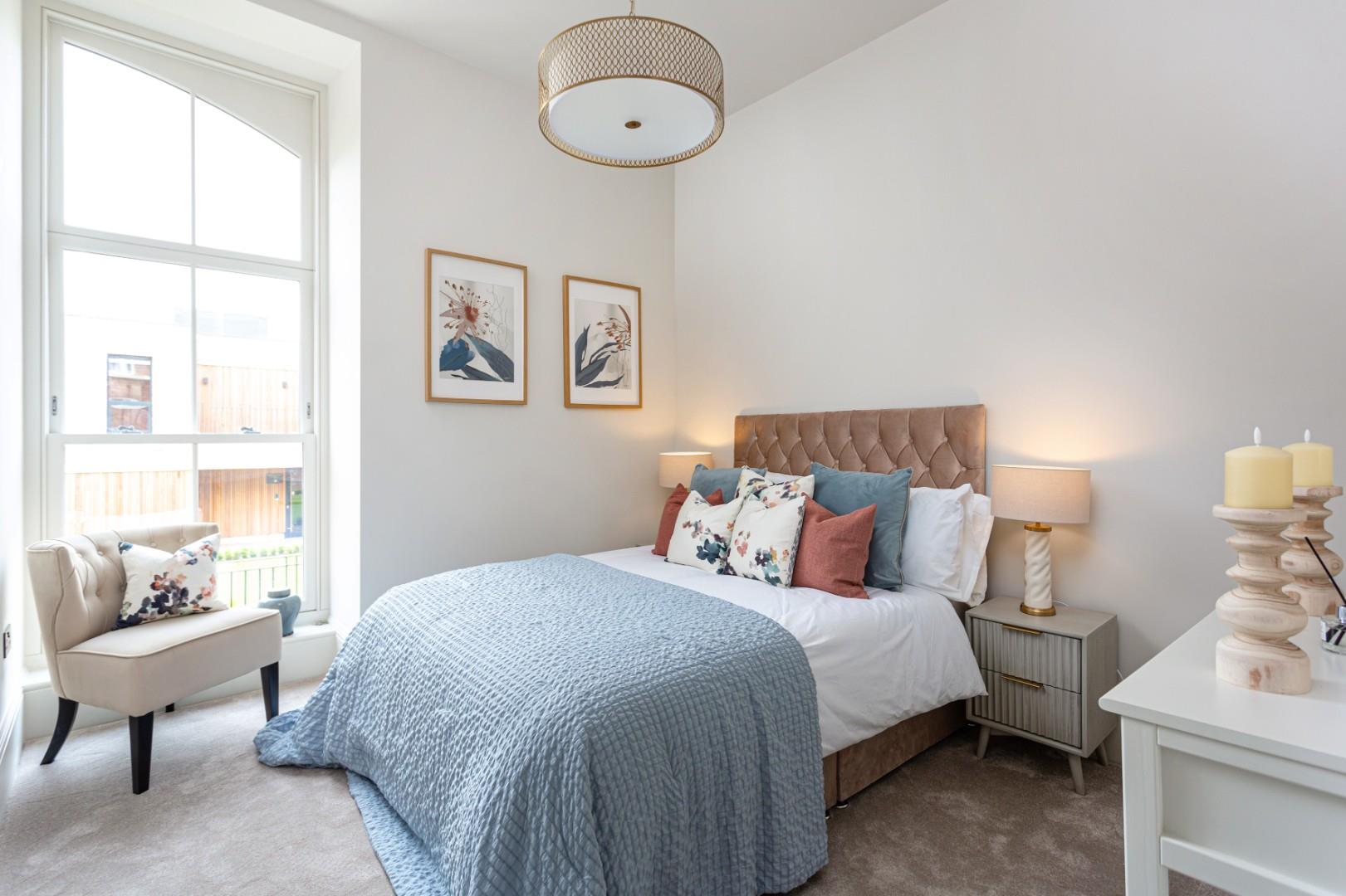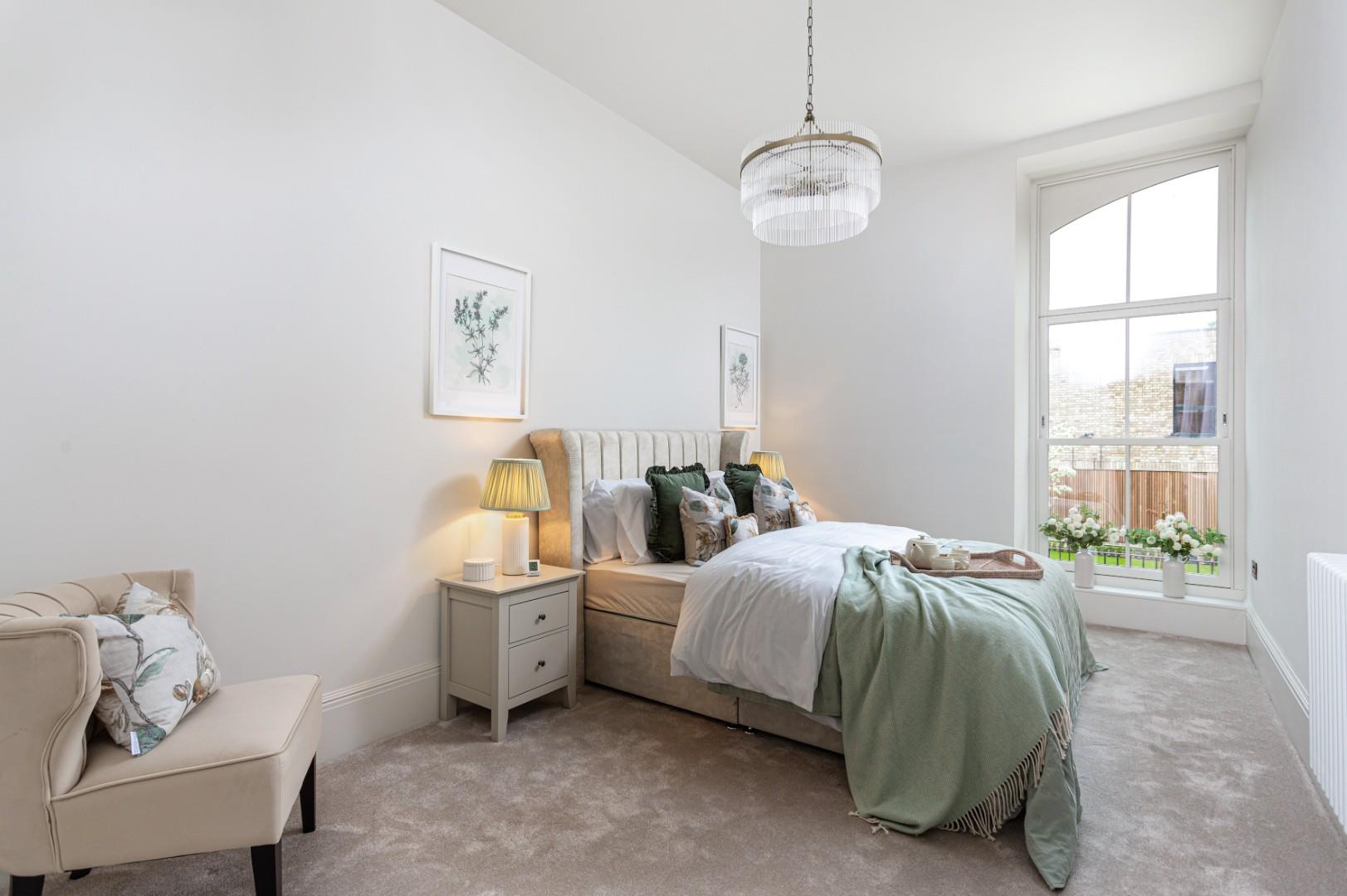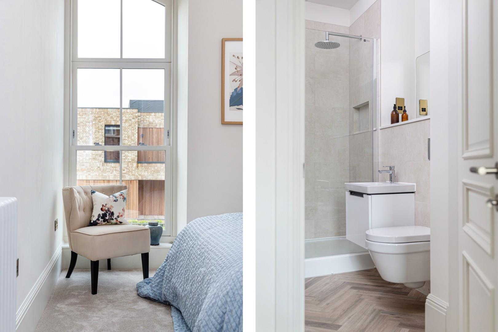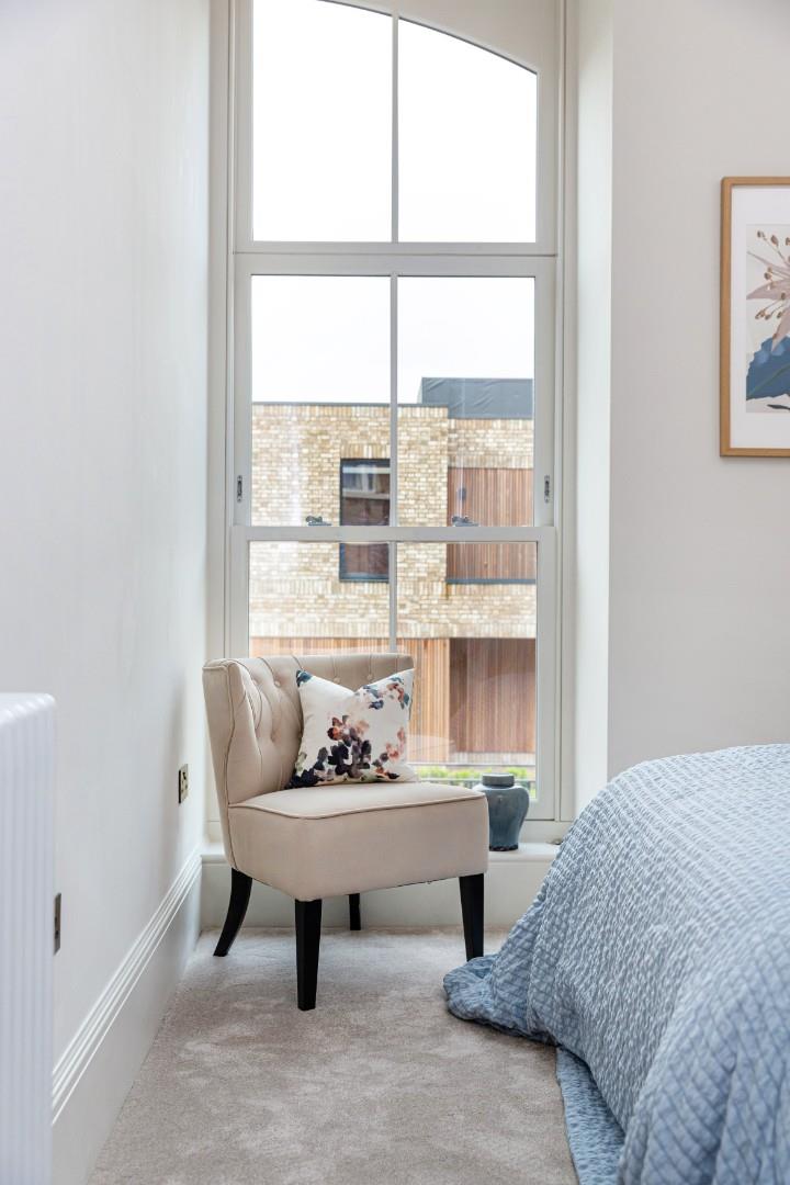 Apartments 2 & 3 - To the upper floor both bedrooms benefit from impressive ceiling heights and striking curved windows, providing delightful views across the meticulously landscaped communal gardens.