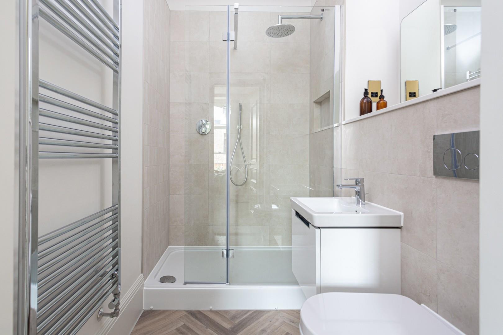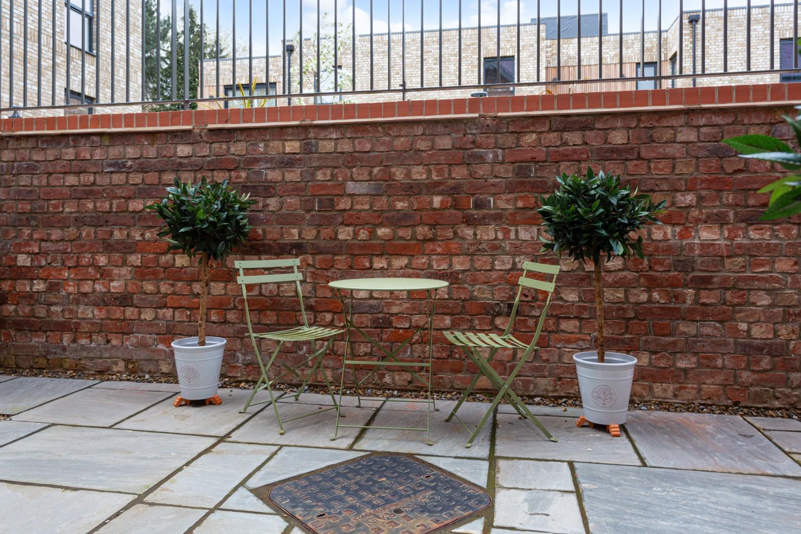 The lower ground floor offers an elegant open-plan living and kitchen space, fitted with an extensive range of high-quality cabinetry and breakfast bar complemented by quartz worktops and premium integrated appliances, including a hot water tap. Bathed in south-west facing natural light, the room features sliding doors that open directly onto a private sunken, walled courtyard, with steps leading to a gated entrance and access to the communal grounds. Furthermore to the ground floor is a well placed utility room with provisions for washing facilities and shelving along with a seperate w/c.