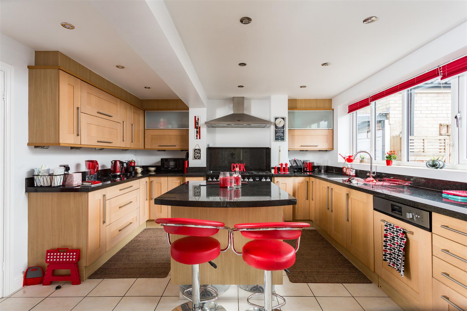 The modern fitted kitchen offers ample storage and generous worktop space, centered around a practical island that provides additional preparation and seating space. A large range cooker,newly purchased is included, along with a built in American style fridge freezer.