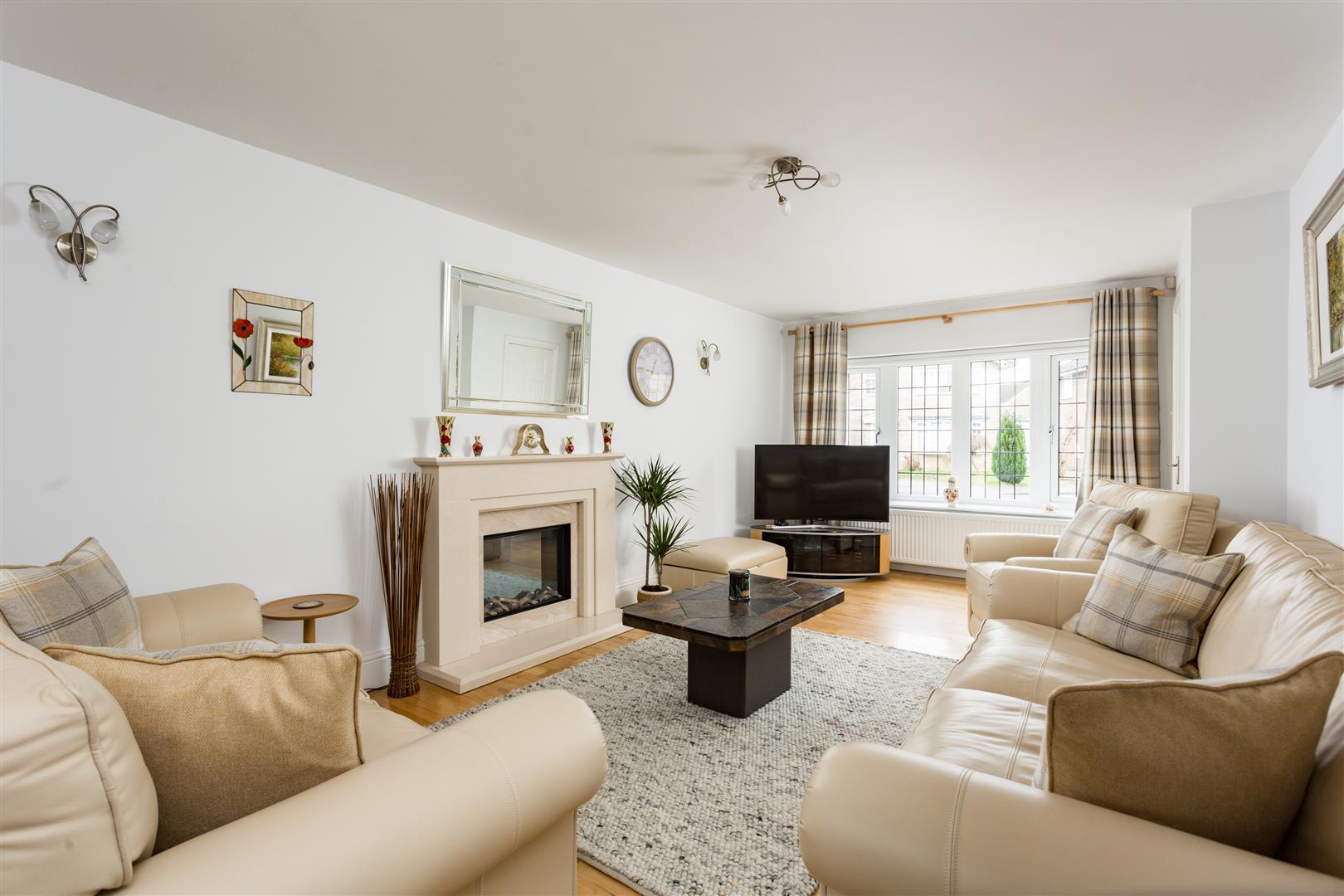 Leading from the entrance hall, the main lounge is a beautifully presented reception space centered around a large bay window. A cream marble fireplace creates an attractive focal point, while the neutral decor enhances the bright, airy feel