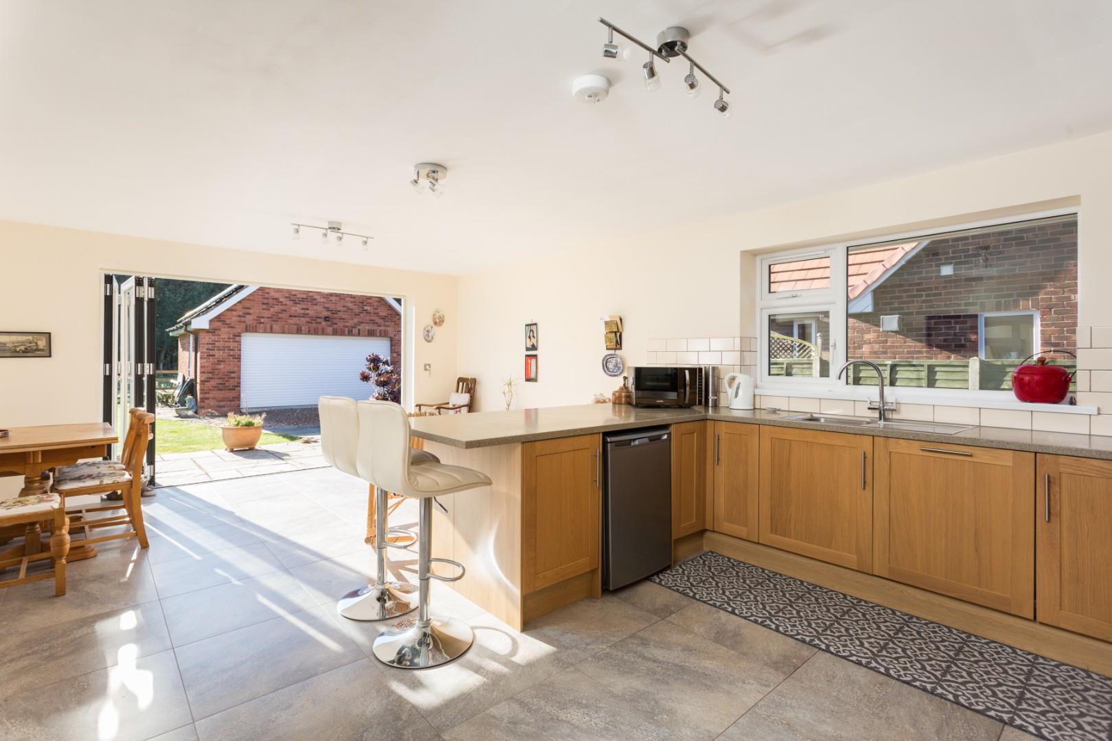 Flowing directly from the kitchen is an outstanding open-plan living and dining area, bathed in natural light and offering ample space for both family dining and informal seating. A further set of bi-folding doors opens onto a raised rear patio, making this an exceptional space for entertaining, summer gatherings or simply enjoying the peaceful garden setting.