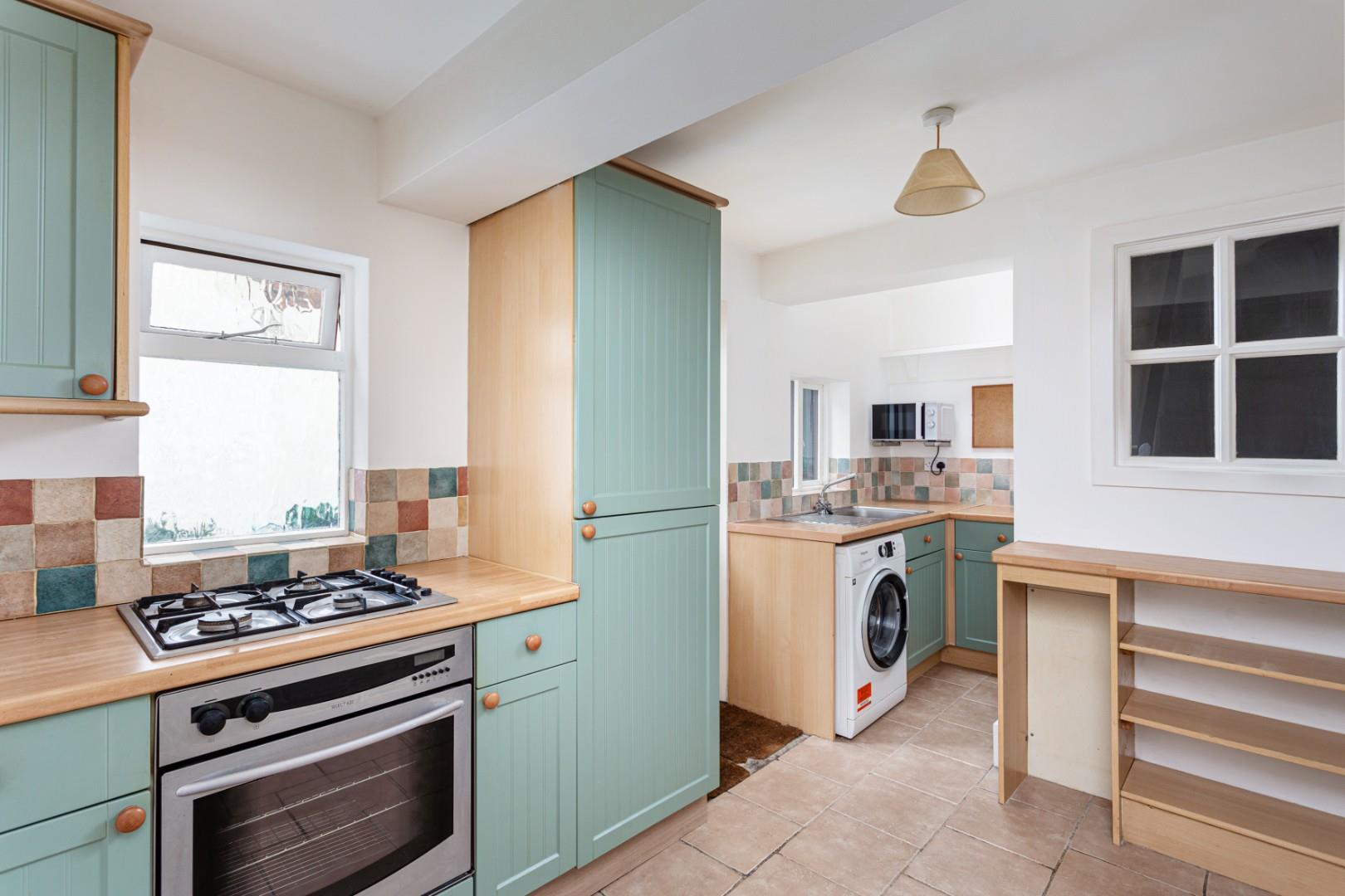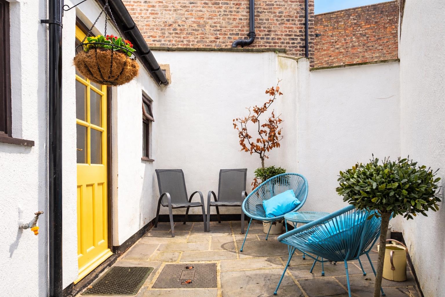 Upon entering, you are welcomed into a cosy yet surprisingly spacious sitting room, rich in character and warmth. This inviting space is centred around a feature fireplace, creating a perfect focal point for relaxing evenings, while doors lead through to the staircase and into the kitchen beyond. The cottage-style kitchen is both functional and full of charm, offering an extensive range of fitted wall and base units, along with integrated cooking facilities including a cooker, hob, and sink. From here, a door opens directly out to the private rear courtyard, seamlessly connecting indoor and outdoor living.
