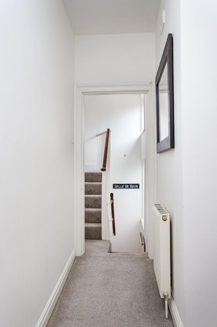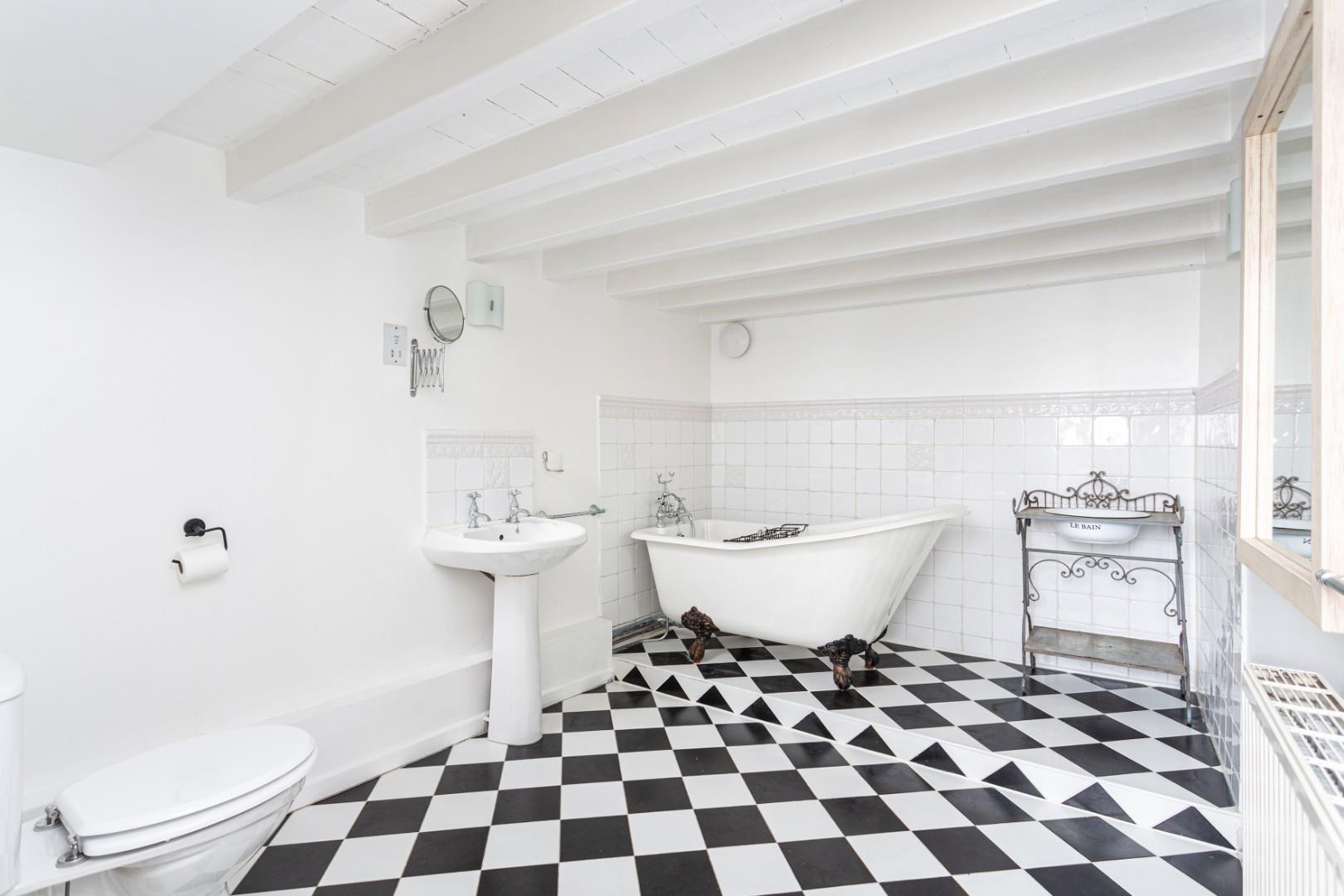 To the first floor, the property offers two well-proportioned and thoughtfully arranged bedrooms, each enjoying a pleasant outlook. A unique split-level staircase leads down to the beautifully appointed house bathroom, which exudes classic elegance. Featuring a stunning three-piece suite, the bathroom includes a roll-top bath with traditional claw feet, a low flush WC, and a pedestal wash hand basin, perfectly in keeping with the home's character.