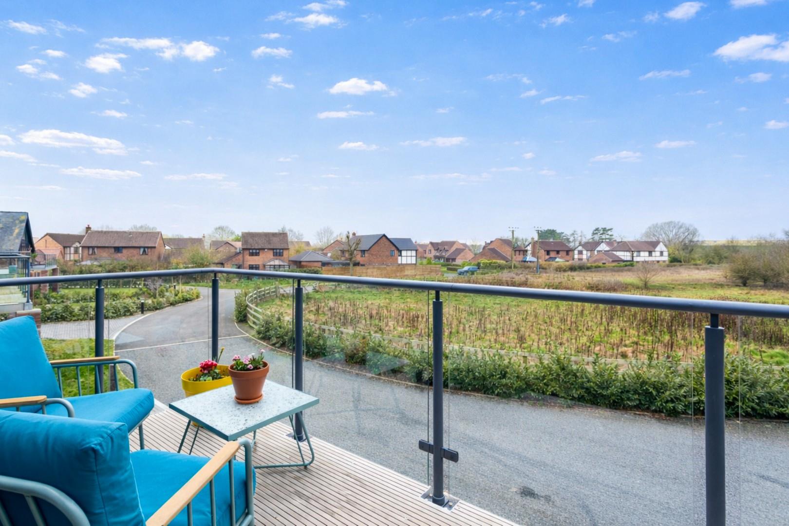 The galleried landing leads off into a larger than average 2nd bedroom with a dramatic 14' (4.27m) high vaulted ceiling and access into generous under eaves storage space, stylish family bathroom with both a bath and a separate walk-in shower. The first floor landing also leads into a spectacular sitting room where a soaring vaulted ceiling, far reaching rural views and double doors opening out onto a 17' (5.18m) wide balcony, combine to create a wonderfully uplifting living space.