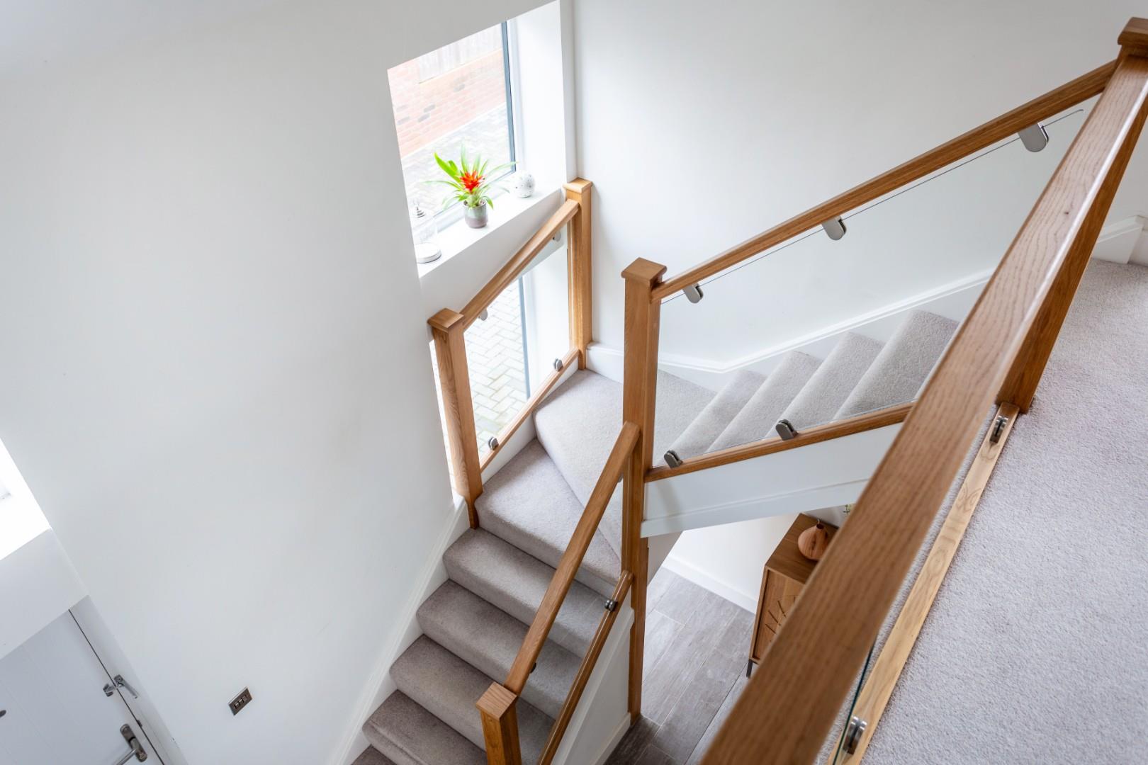A spacious reception hall with modern oak and glass staircase rises up to a galleried landing and oak doors lead off into an L-shaped dining kitchen and living room designed for relaxed living and effortless entertaining. Bi-folding doors open seamlessly onto a paved seating terrace and a superbly appointed kitchen enjoying meadow views, features Silestone worktops and a dining bar, generous storage and a comprehensive range of integrated appliances (5 ring gas hob, eye-level microwave, oven and grill, fridge freezer, dishwasher and wine chiller) complemented by a well designed utility room with direct access out onto the drive.