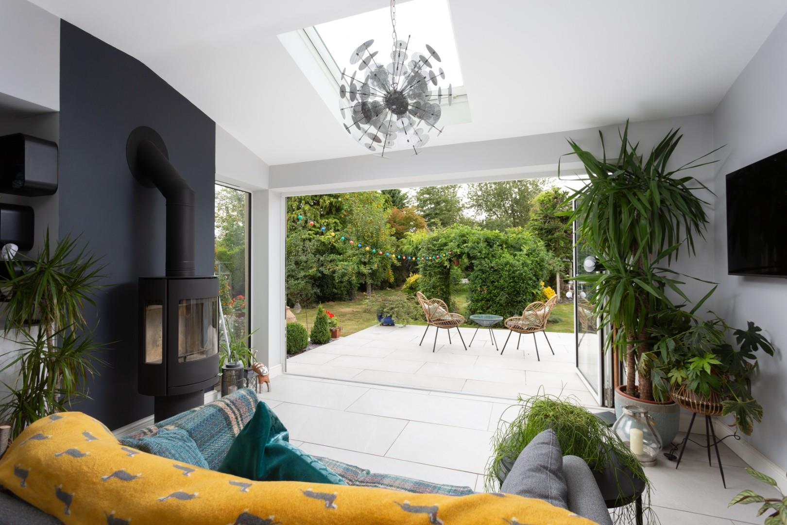 The kitchen seamlessly flows into a versatile living space, anchored by a wood-burning stove and enhanced by bespoke bi-folding doors, which open directly onto a newly landscaped raised terrace - perfect for enjoying the outlook over the mature gardens.
