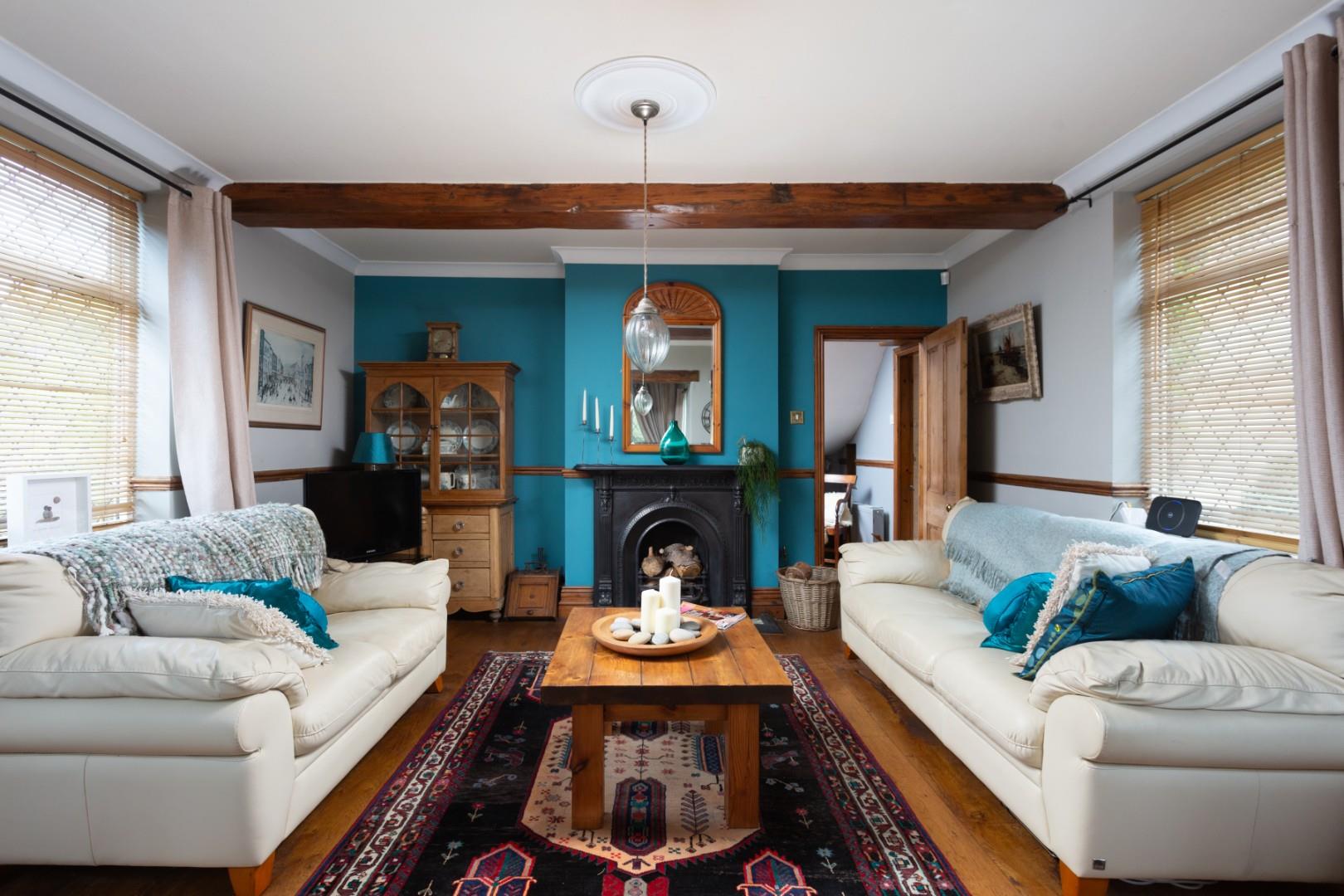 The formal living room, located at the front of the property and forming part of the original 1870 building, is steeped in history and atmosphere. Bursting with character, it boasts feature fireplaces, a pair of distinctive oval windows, a traditional front door, and exposed oak ceiling beams that showcase the home's enduring heritage.