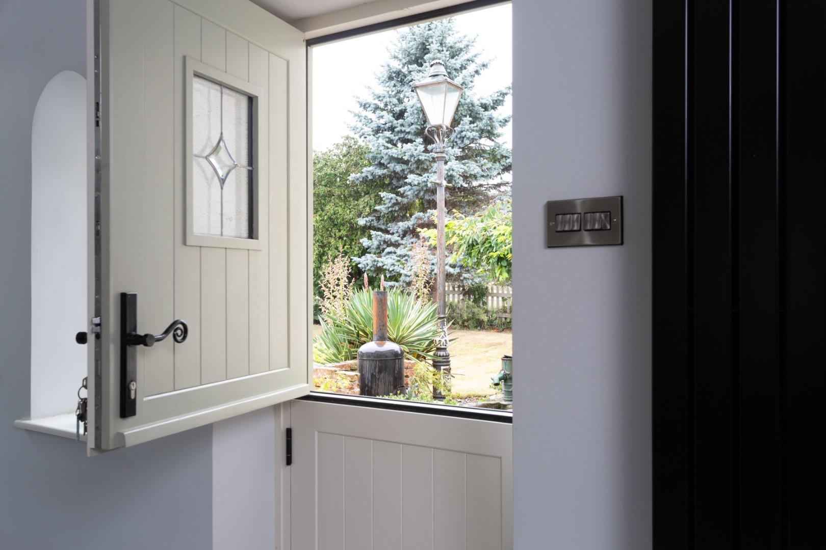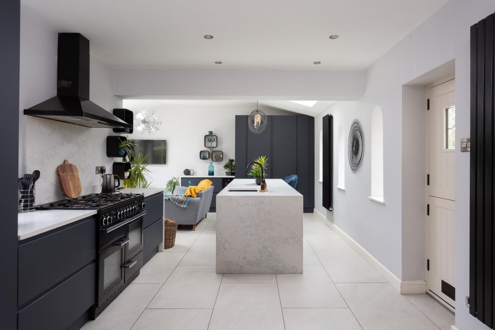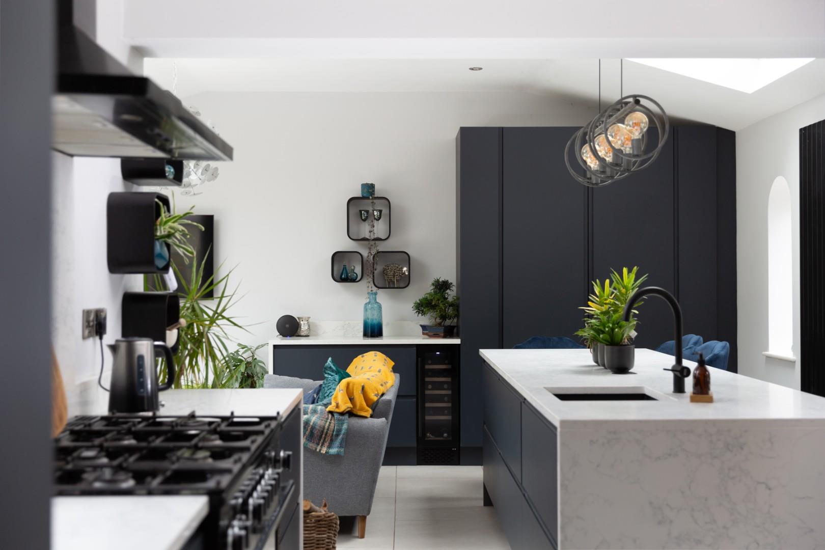 The home is approached via a charming hard wood stable-style door which opens into the heart of the property - the open-plan kitchen living space. This bespoke kitchen is a statement of style and function, with dark navy cabinetry complemented by sleek white quartz work surfaces. A large central island, complete with inset sink and generous storage, creates the perfect focal point for family gatherings and entertaining. Alongside, a tall bank of units with integrated shelving and hidden storage adds both elegance and practicality.