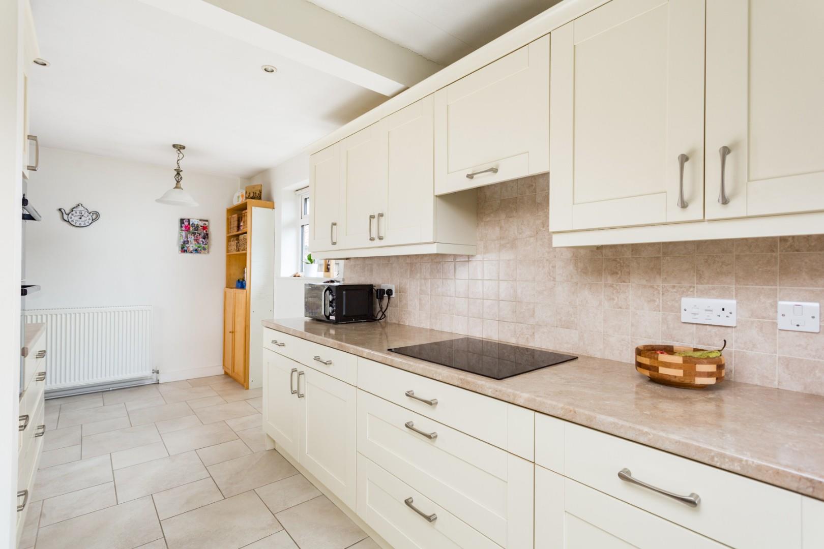 The 24'6" (7.47m) long dining kitchen features a tiled floor and provides generous worktop space and a good range of storage cupboards, complemented by integrated appliances (fridge, freezer, touch control Bosch hob, eye-level Bosch double oven and grill), further freestanding appliance space and a double glazed door providing access out to the side of the property.