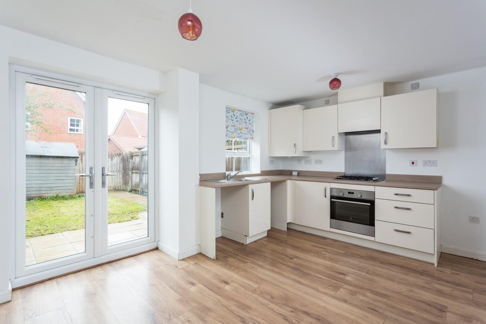 Located towards the rear of the property is the open plan dining kitchen. The kitchen has a combination of base and wall storage units with laminate preparation surfaces incorporating a stainless steel sink with mixer tap over. There is an integrated Electrolux oven and four ring Zanussi gas hob as well as space for a washing machine, dishwasher and fridge/freezer. The kitchen also has ample space for a freestanding dining table and there are French doors to the rear elevation leading out to the garden as well as a useful understairs cupboard for storage.