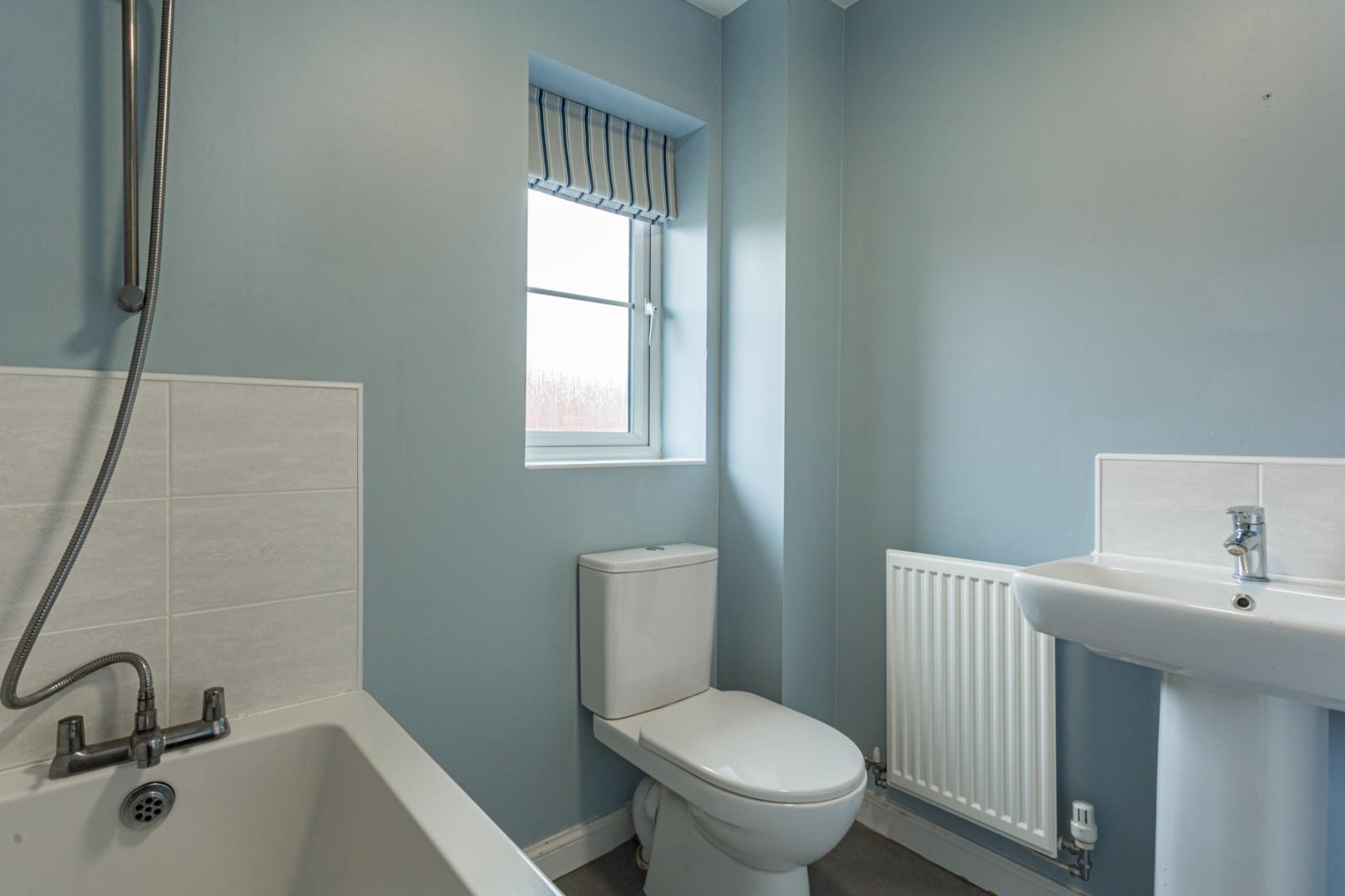 The house bathroom comprises a three-piece suite including bathtub with shower over, low flush WC and wash hand basin with mixer tap over.