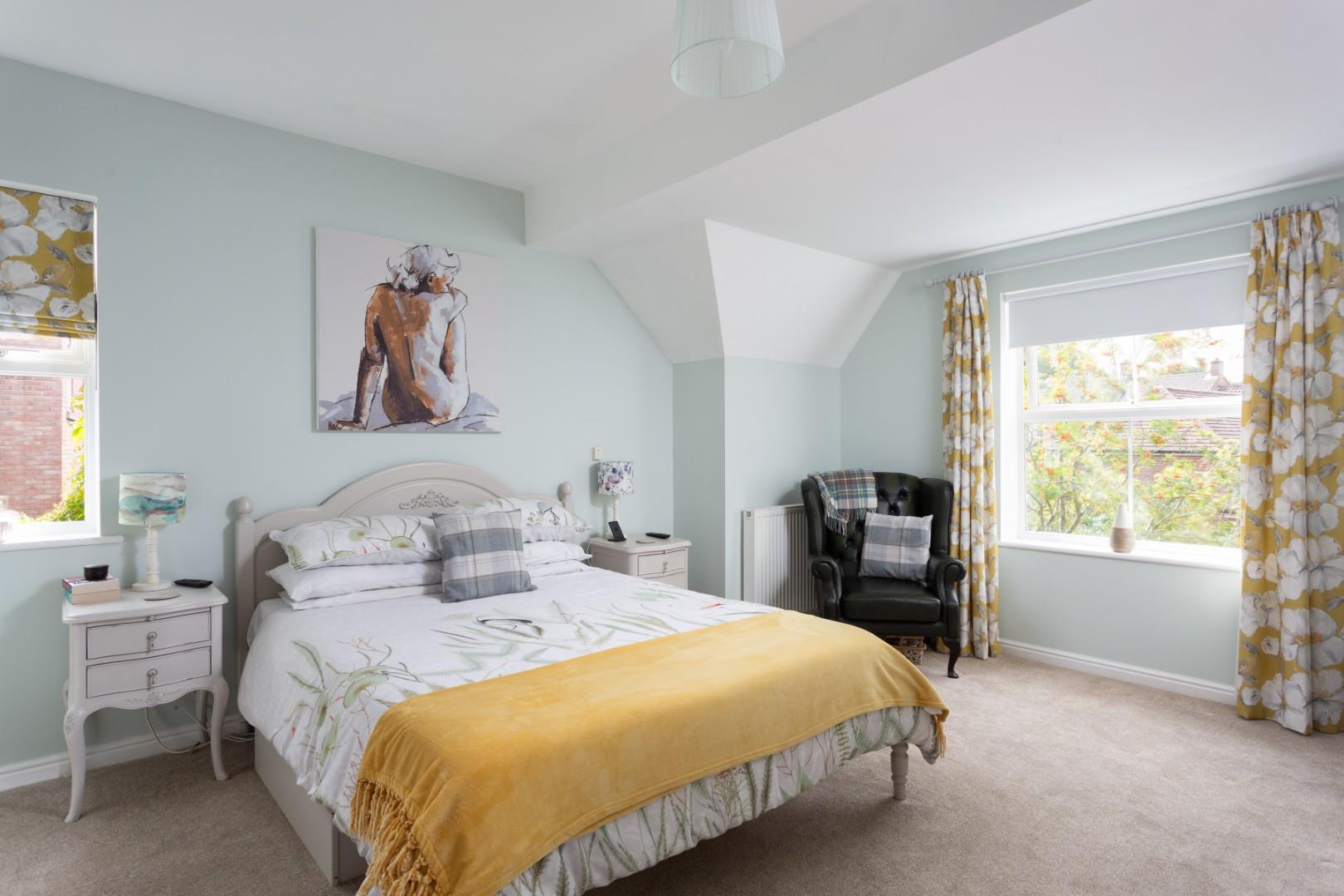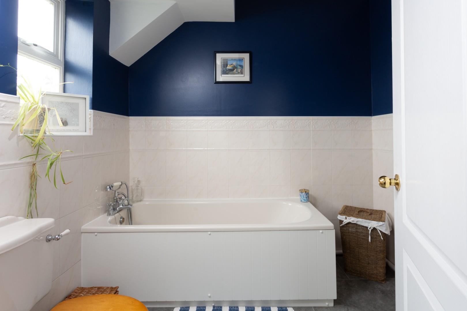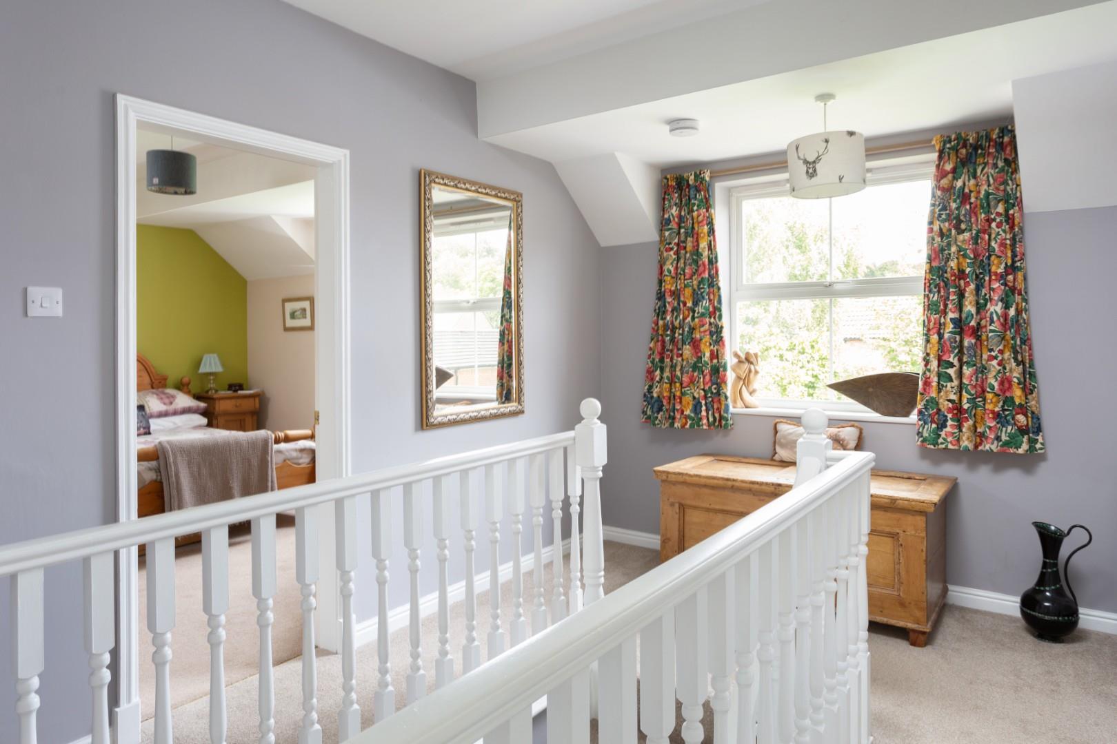 The spacious first floor landing enjoys rooftop views and woodland glimpses and leads off into a generous primary bedroom with built-in wardrobes and an en-suite bathroom with both bath and separate walk-in shower. guest bedroom with en-suite shower room, 2 further double bedrooms and an attractively appointed house bathroom.