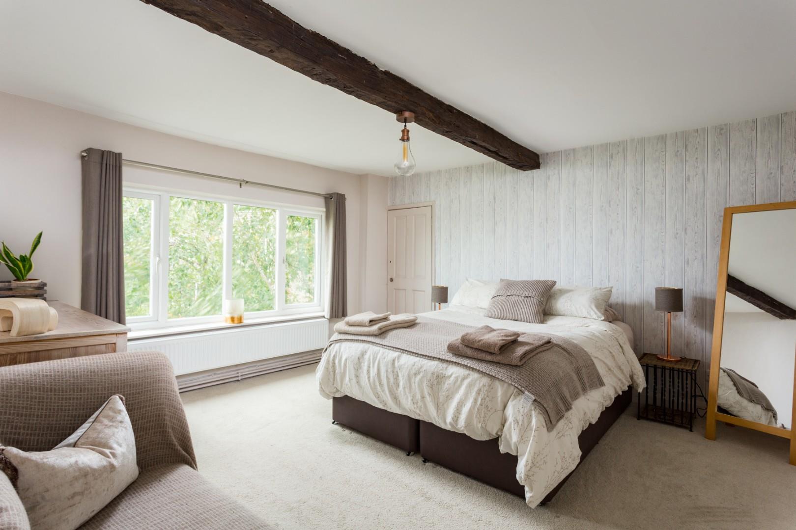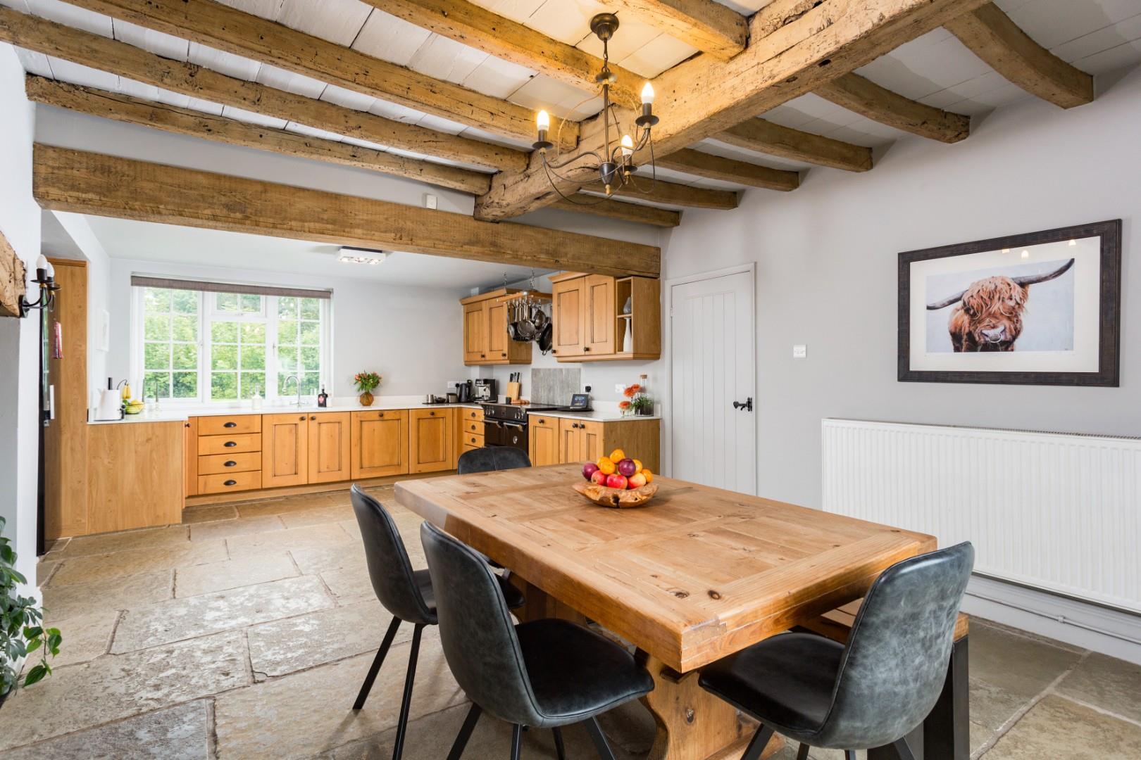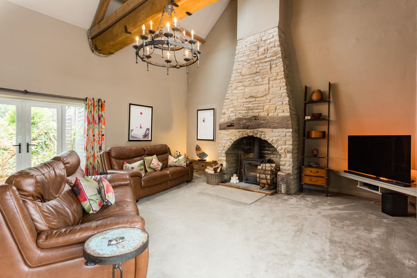 The impressive 22'11" (6.98m) long dining kitchen is the true heart of this home, combining rustic charm with practical elegance to provide quartz worktops and a range of oak fronted cabinetry with space for freestanding appliances alongside an integrated dishwasher. Character features such as exposed beams and a striking inglenook fireplace add warmth and authenticity while bi-folding doors provide outstanding views and lead you out onto a vast south facing patio, effortlessly blending indoor comfort with outdoor living.