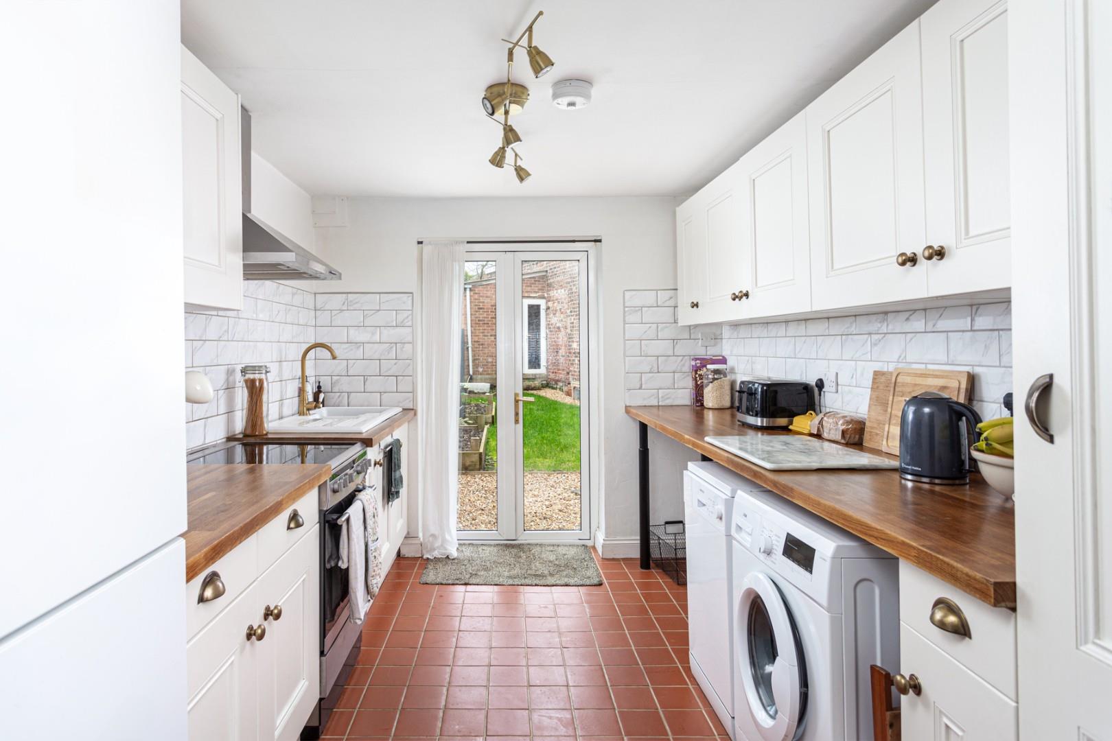 Positioned just off the dining room is the charming kitchen, featuring solid oak work surfaces and a pair of French doors that open onto the rear garden. The kitchen itself comprises a range of shaker-style fitted wall and base units, with integrated appliances, a Farmhouse style sink and brass adornments including tap and unit/drawer handles. The space beautifully combines modern functionality with traditional style.