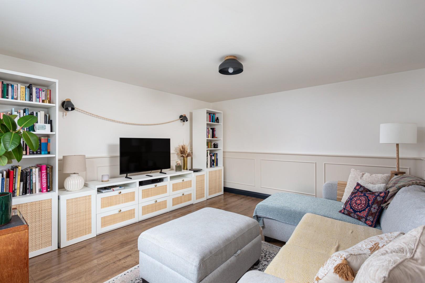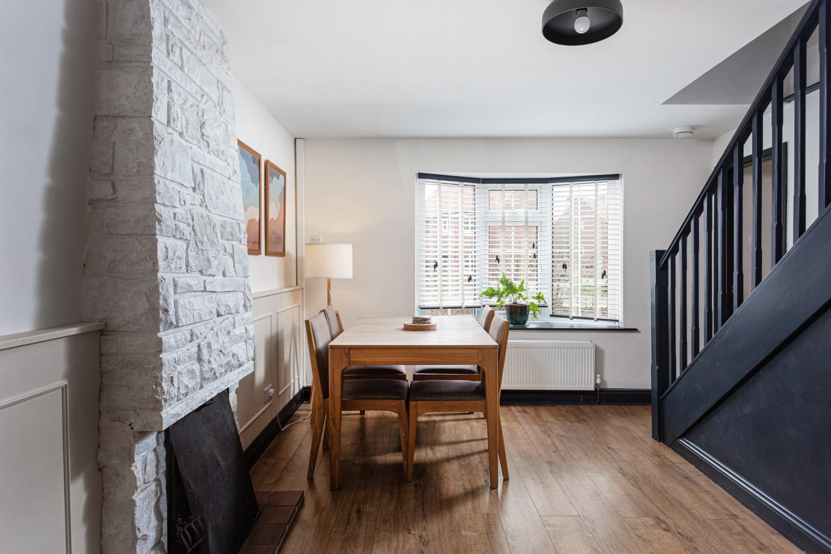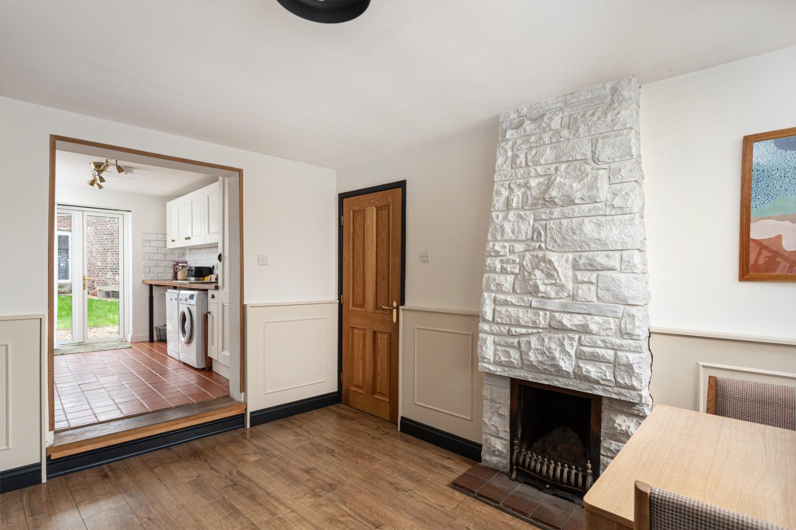 Upon entering, you are welcomed into an inviting entrance hall, leading left into a spacious dining room which offers a bright and flexible space ideal for both everyday family living and entertaining guests. A large window to the front of the property fills the dining room with natural light. With contemporary panelling to the walls and an exposed brick chimney breast with feature fireplace, the space perfectly blends character features with modern decor.