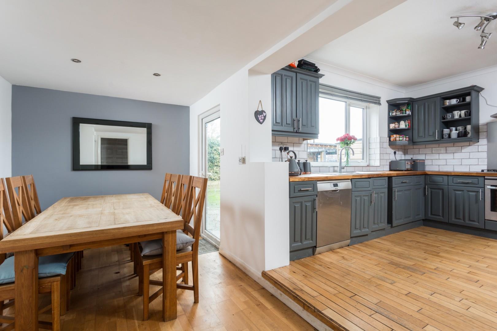 The kitchen is positioned overlooking the rear garden and enjoys an extensive range of wall and base units, having solid wood worktops with fitted electric oven, gas hob and extractor and space for a range of freestanding appliances. Stepping down from the kitchen is the dining area with door leading to the garden along with a well placed utility room / pantry which thereafter gives access to the garage.