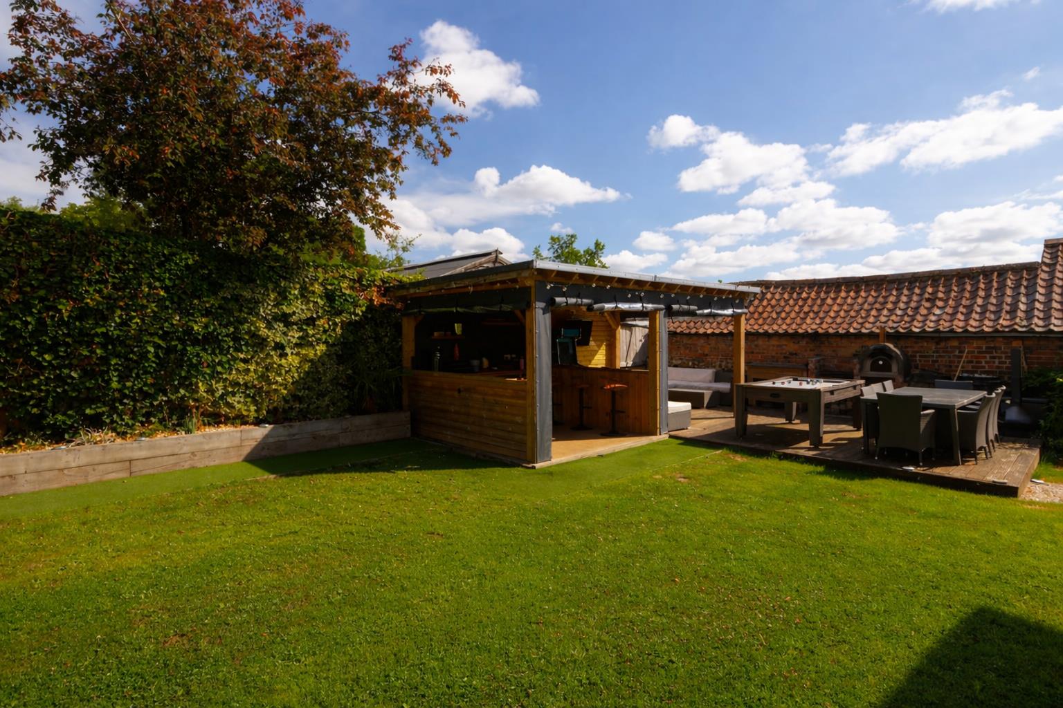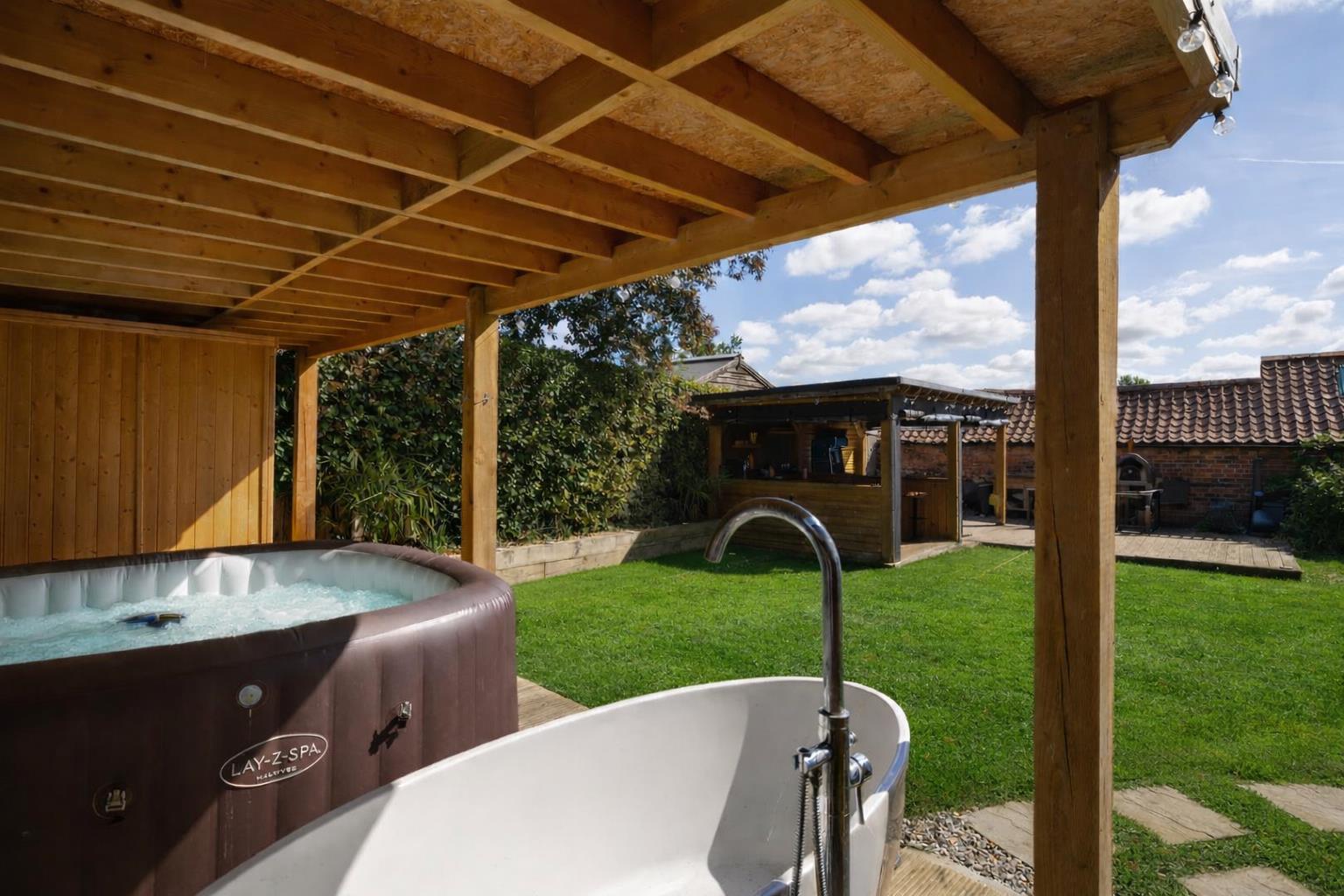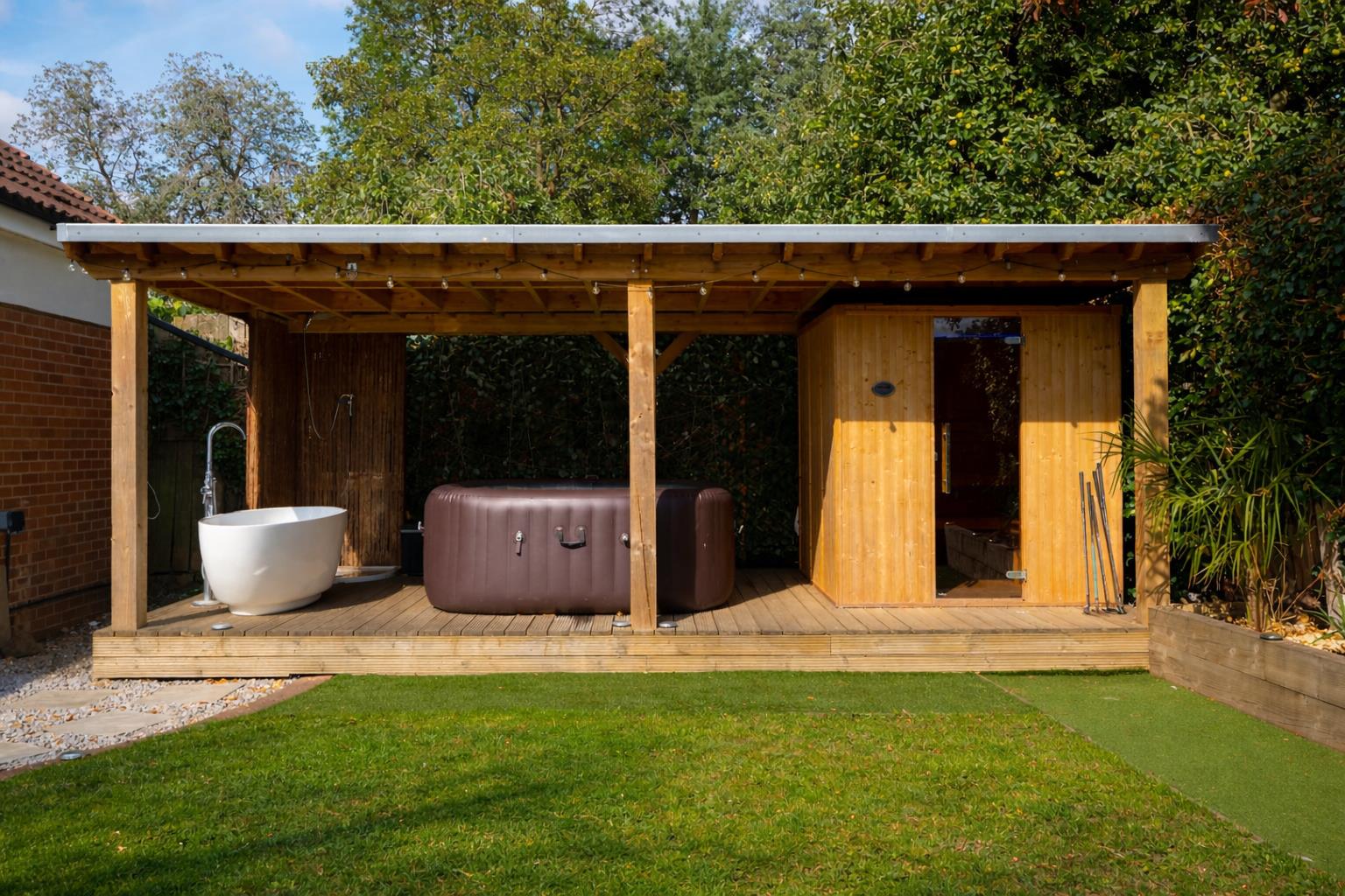 To the rear is a superb space allowing for wonderful outside living. The vendor has cleverly created an outside, covered and heated lounge area, with a bar to one side and an outdoor kitchen to the other with BBQ and pizza oven. To the centre of the garden is a laid lawn with an artificial golf putting green. Furthermore you will find an outdoor 'Spa' area with Sauna, space for a Jacuzzi, and ice bath with shower completing this superb outdoor space.