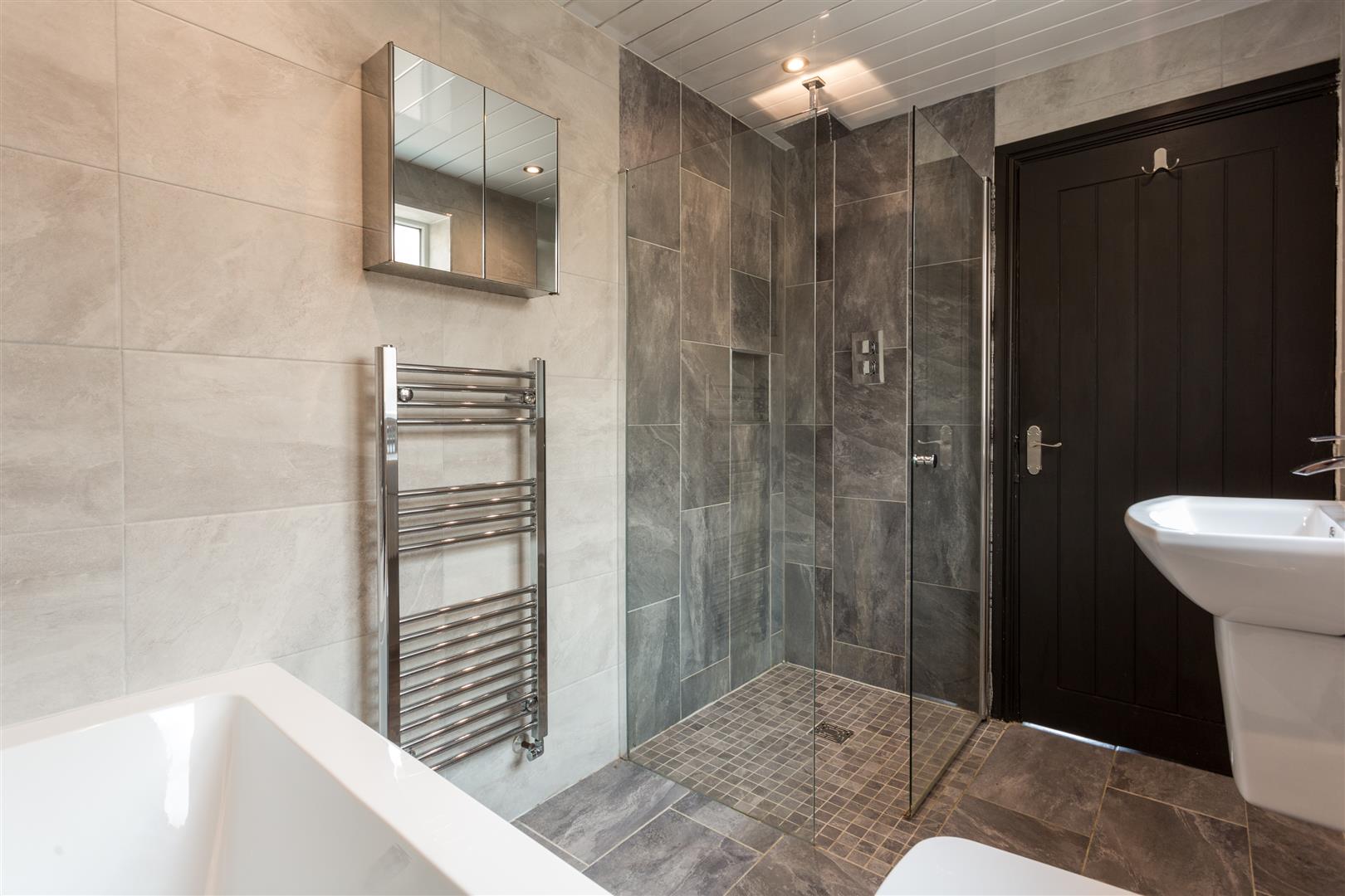 The contemporary bathroom is fully tiled and comprises a three-piece suite including jacuzzi style bathtub, walk-in shower cubicle, low flush WC and wash hand basin with mixer tap.