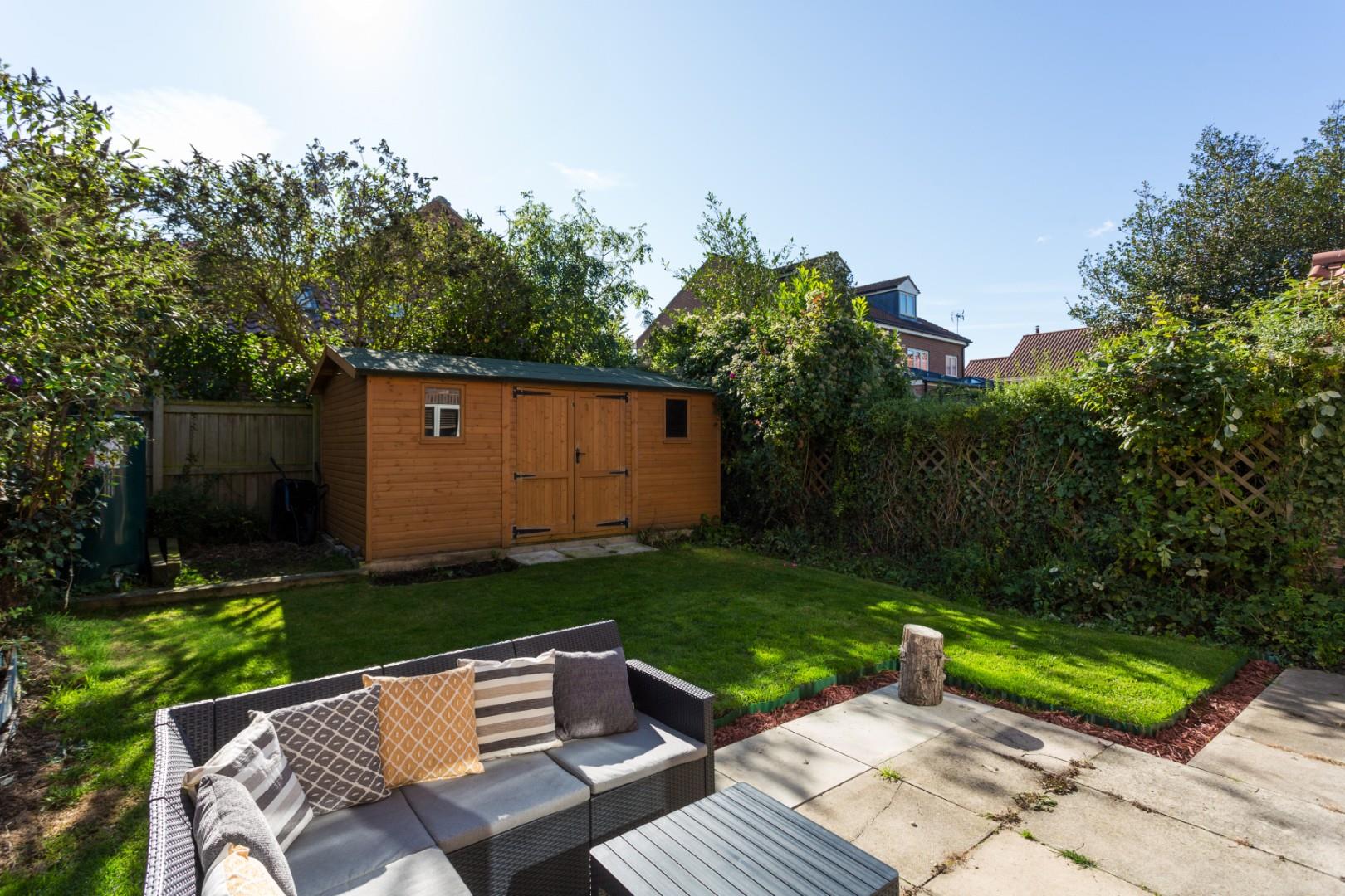 The lawned rear garden features a paved seating area and a good sized timber built garden shed.