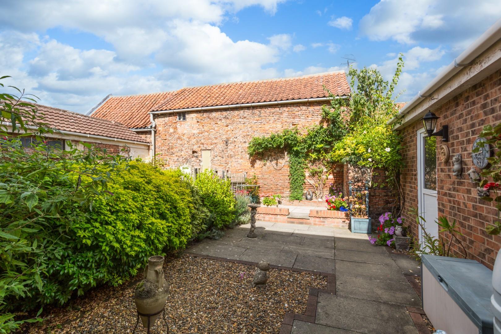 The delightful walled rear garden provides an attractively landscaped low maintenance area with a rustic red brick backdrop.