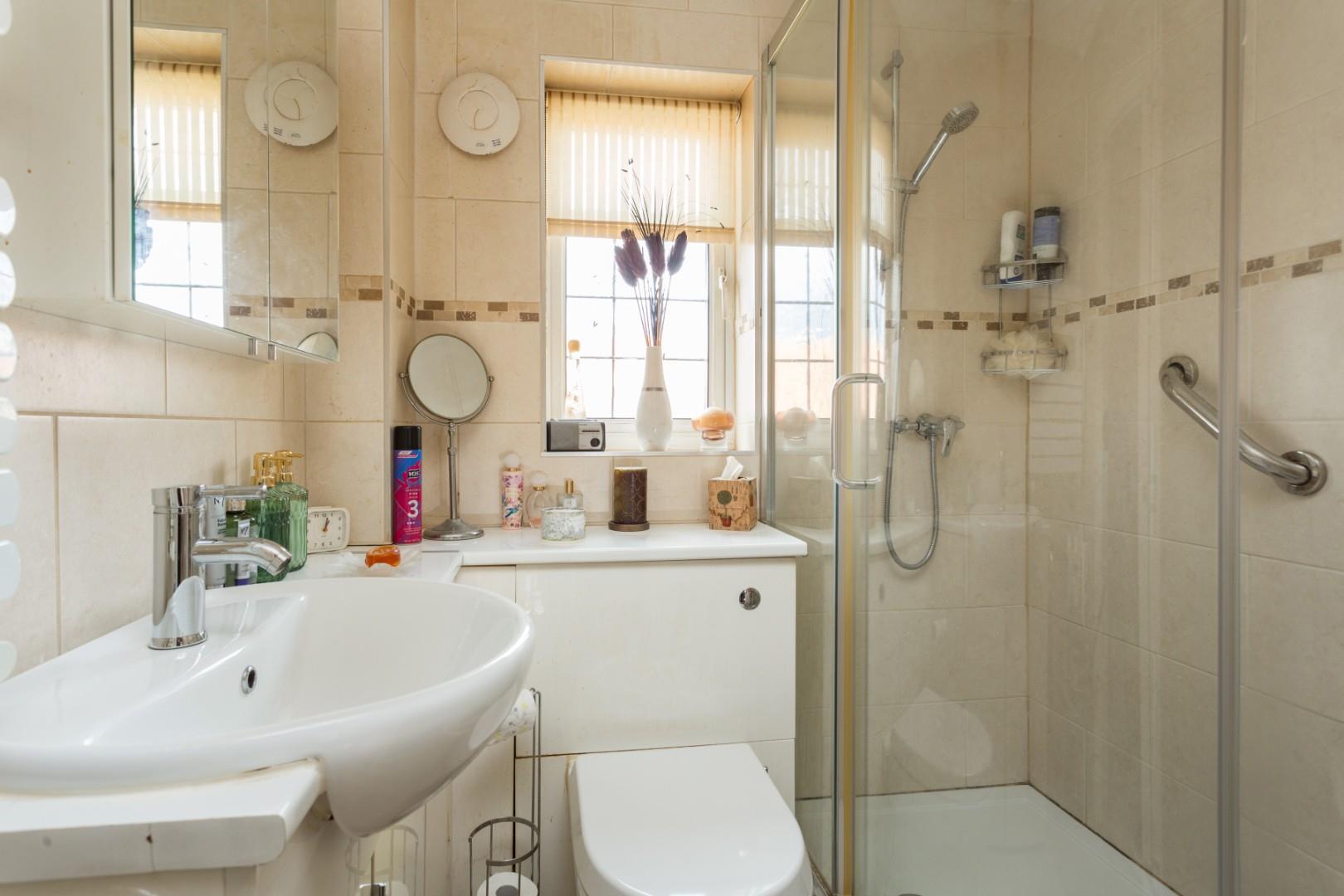 The first floor landing leads off into an impressive principal bedroom with fitted wardrobes, second double bedroom and a shower room with heater towel rail and a walk-in shower.