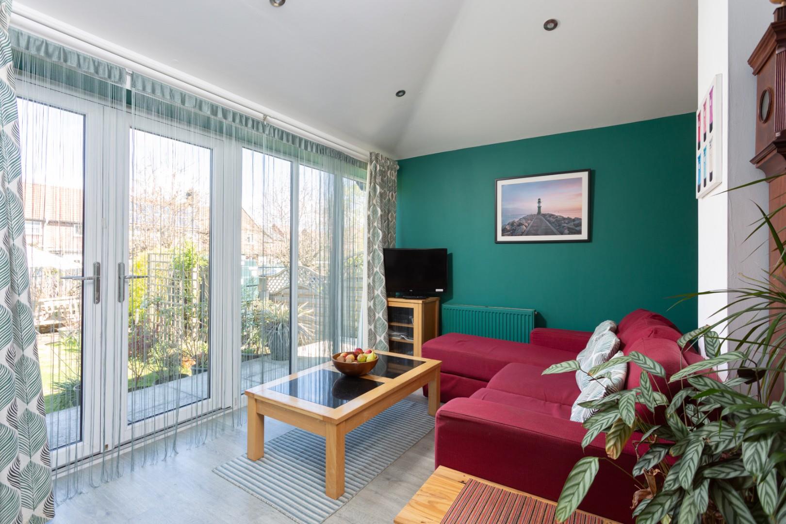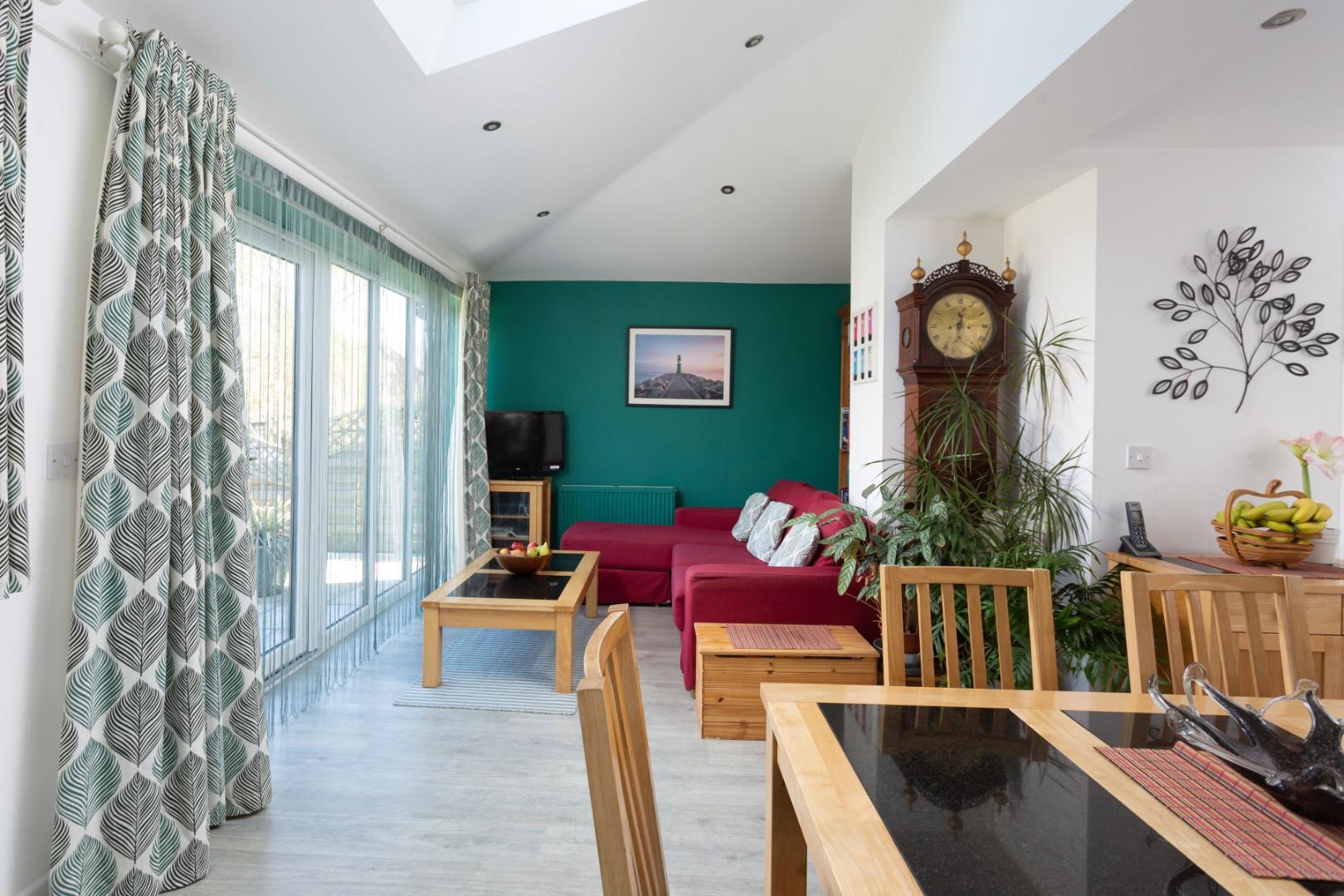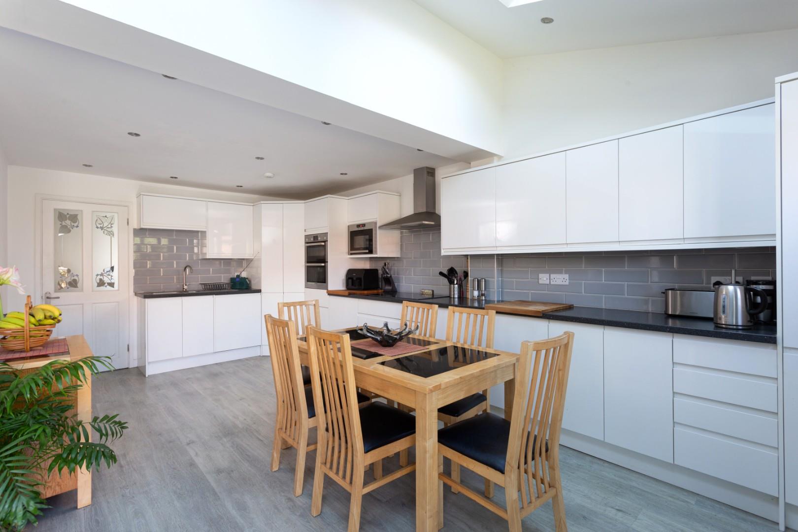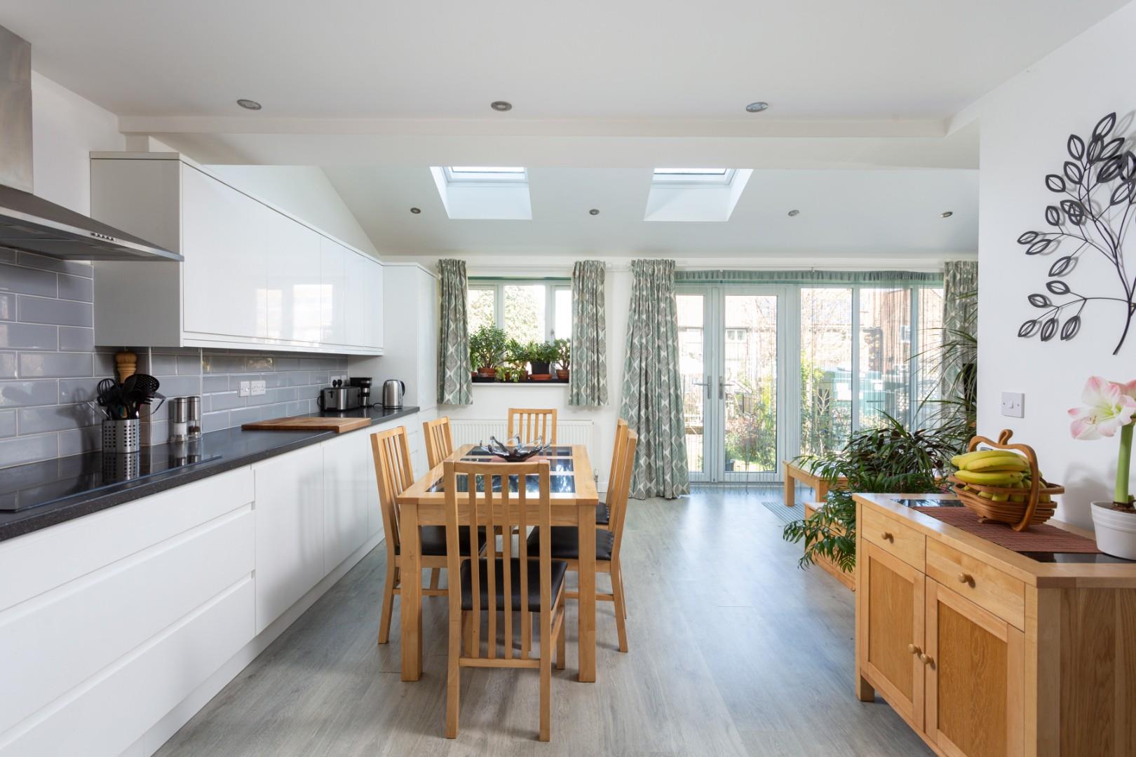 The feature room of the property is the expansive, modern kitchen/dining/living space, with Velux roof lights and French doors opening out into the garden beyond. The kitchen is well appointed with a comprehensive range of matching contemporary units with worktops, sink and drainer, and integrated appliances including an oven, four ring electric hob, Lamona microwave, dishwasher and fridge/freezer, and further benefits from a large larder cupboard.