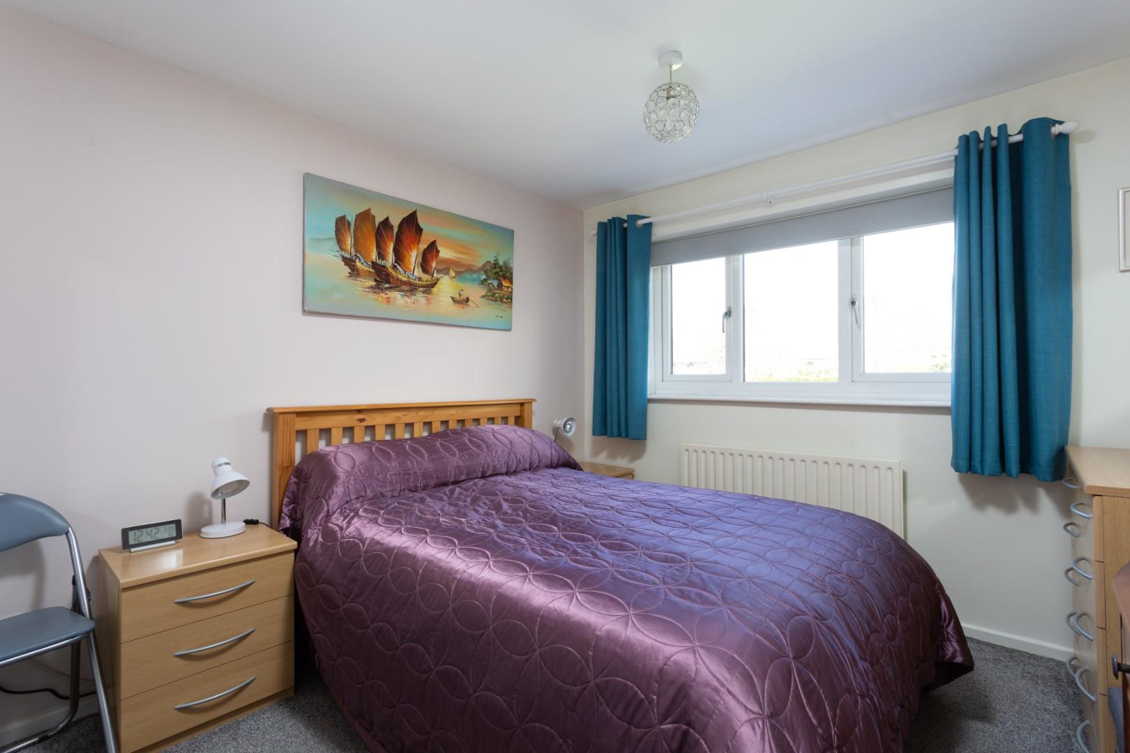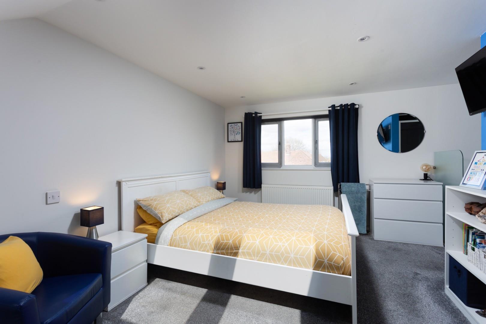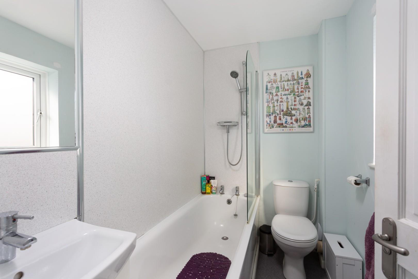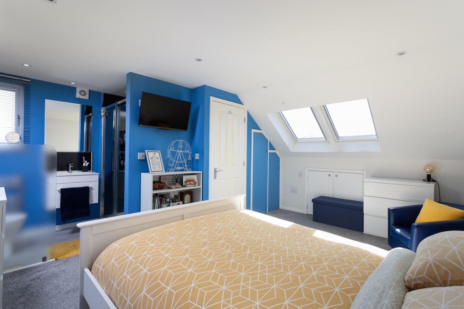 The principal bedroom on the second floor offers a generous double with twin Velux roof lights, an array of fitted storage cupboards and space for freestanding furniture. A thoughtfully appointed en-suite includes a low flush WC, vanity wash hand basin, heated towel rail and an enclosed shower cubicle with both rain and handheld shower attachments, finished with panelled splashbacks.
