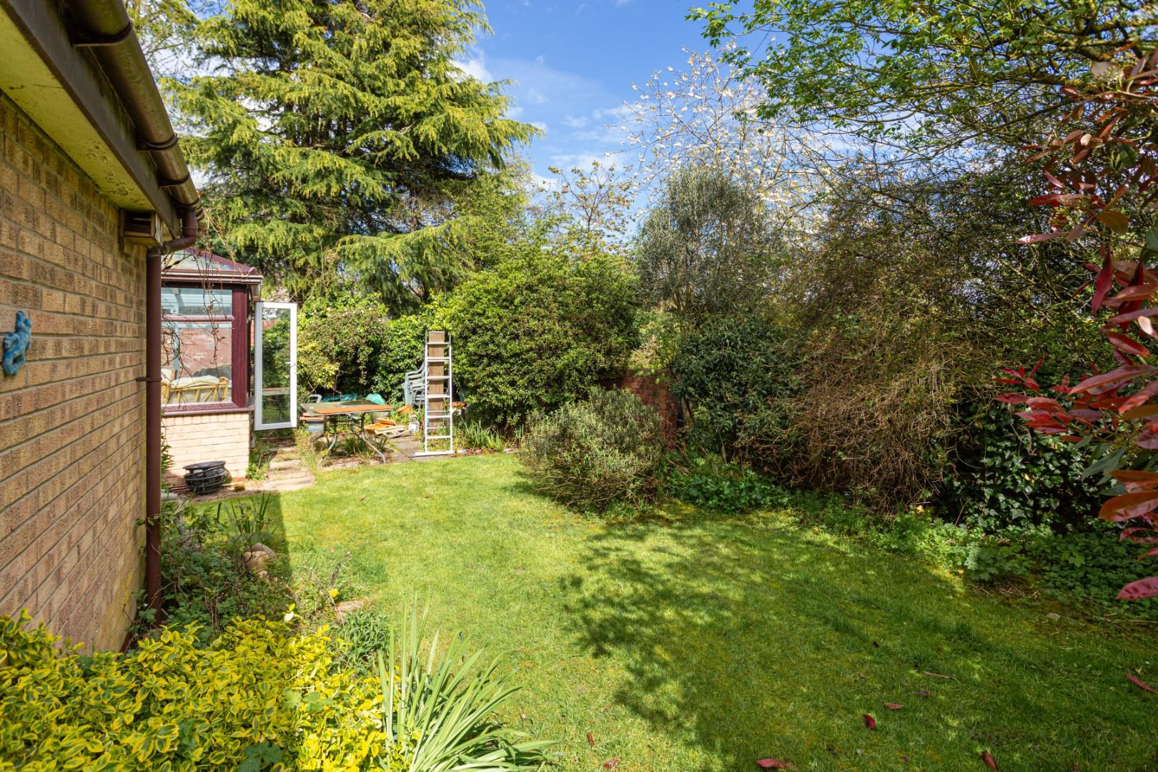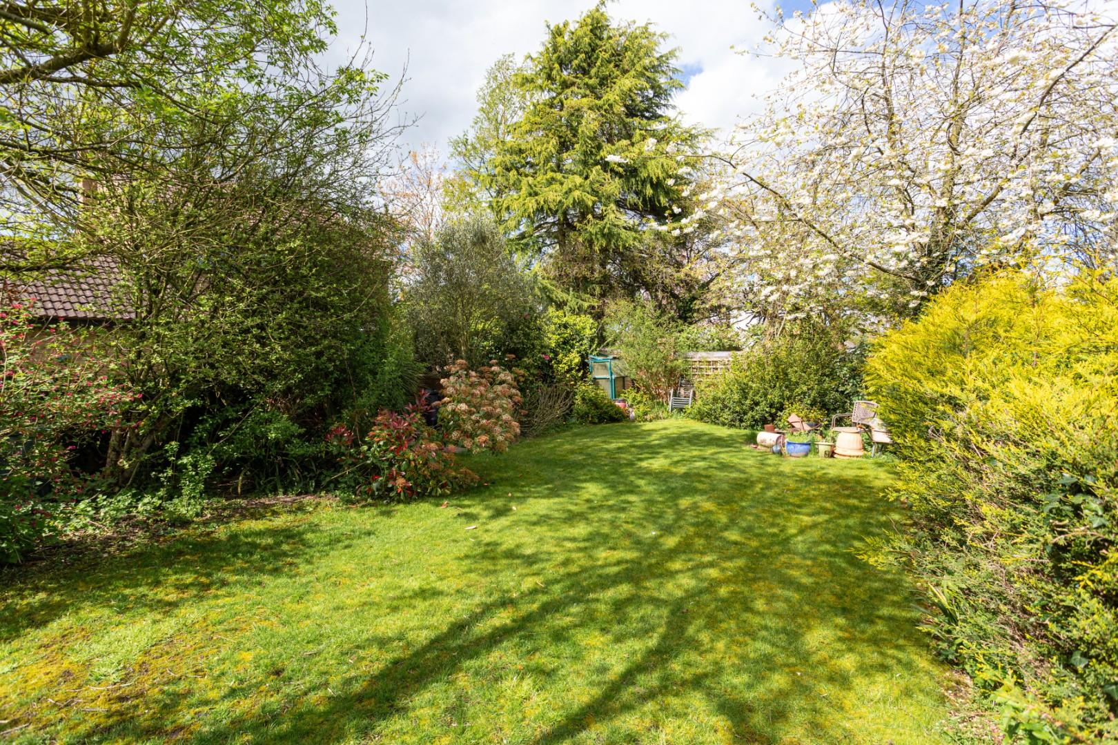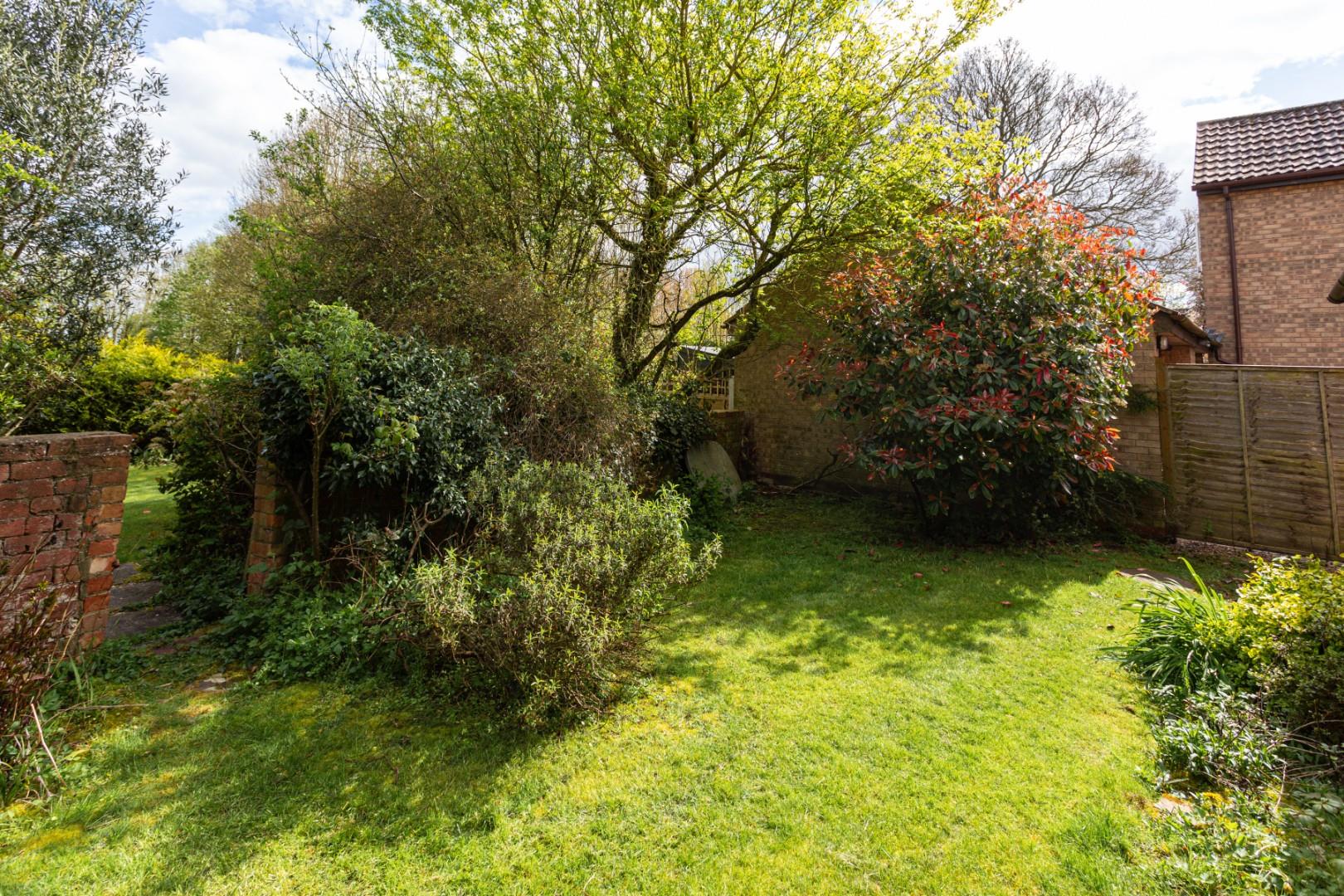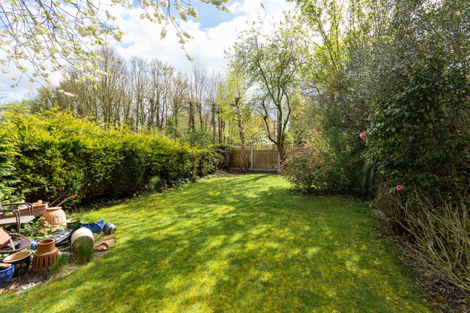 A pathway runs alongside the garage, leading to the rear garden. Although the garden is currently somewhat overgrown in parts, it offers a surprisingly large space. The garden is mainly laid to lawn, bordered by brick and fenced boundaries on all sides, with a number of mature trees providing excellent privacy.