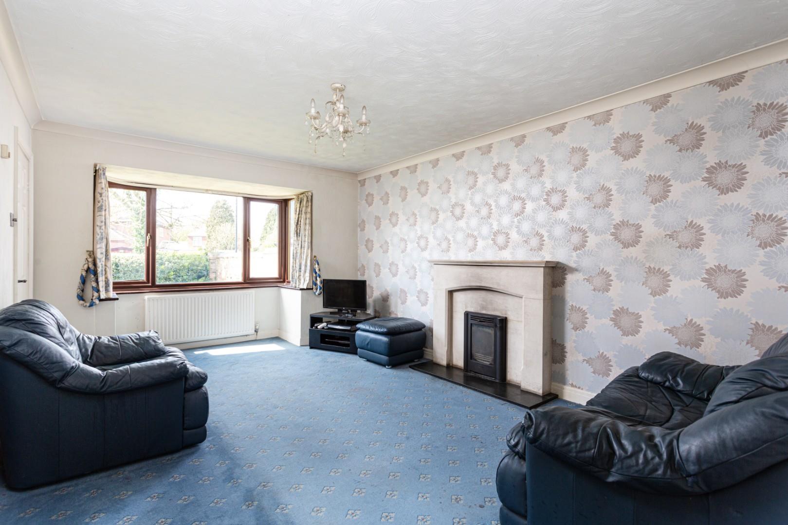 To the left of the hallway is the main reception room, a generous space featuring a large uPVC bay window to the front and an inset wood-burning stove set centrally along the back wall. There is ample room for comfortable seating arrangements.