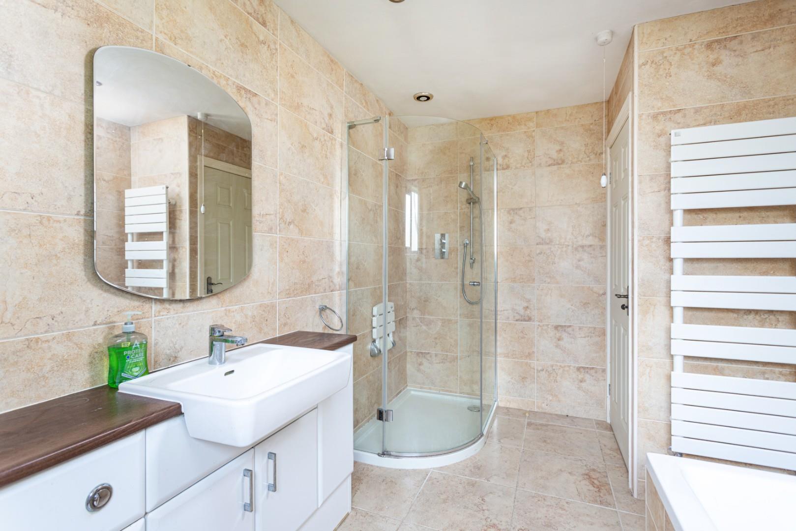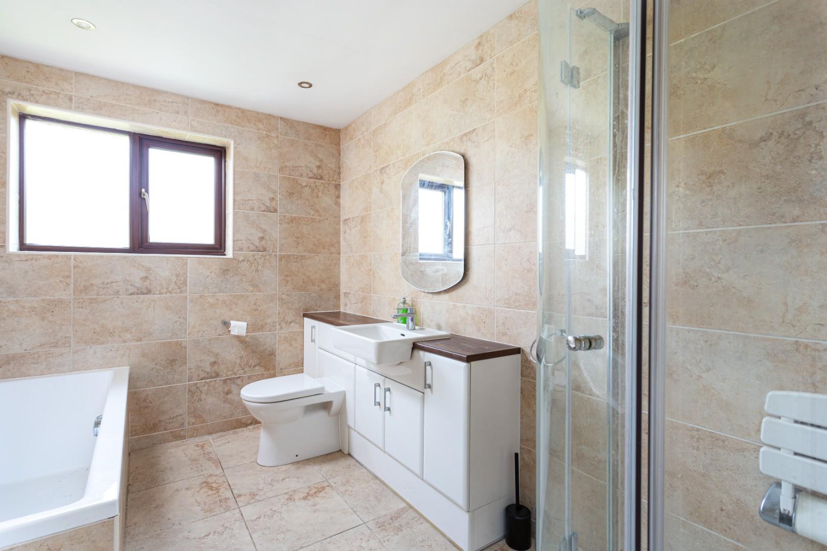 The internal accommodation is completed by a modern house bathroom, which includes a fully tiled inset bath, a separate walk-in shower, a back-to-wall WC, and a hand wash basin with built-in storage underneath. The bathroom is fully tiled on all sides and floor, and is finished with recessed spotlights in the ceiling.