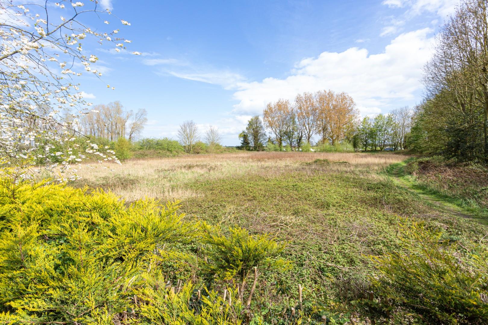The garden is divided into two sections by a brick wall, with a walkway leading to an extended part of the garden. The backdrop beyond the garden is private land, with additional trees on the right-hand side.