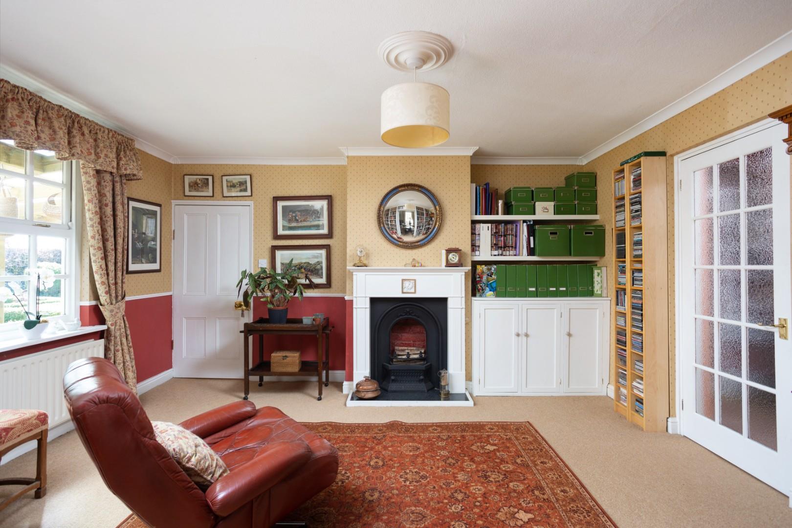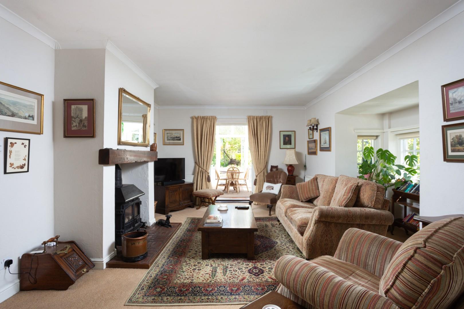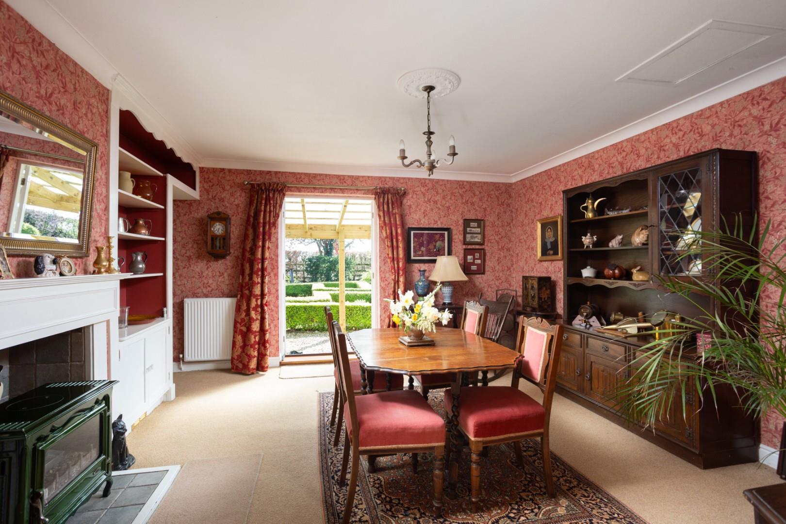 Also located off the kitchen is a separate dining room with French doors to the side elevation leading out onto the gardens beyond. The dining room includes a floor mounted cast iron stove with tiled hearth. The dining room includes a bank of misplaced shelving either side of the chimney stack, in addition to 2 separate radiators.